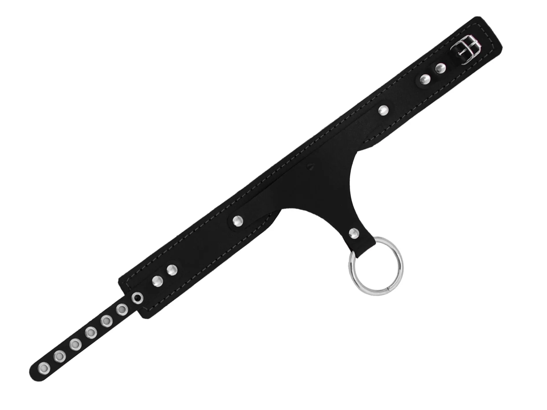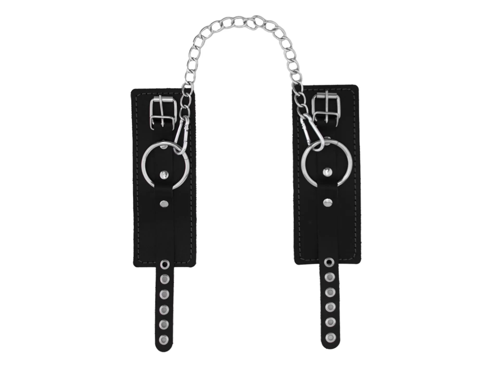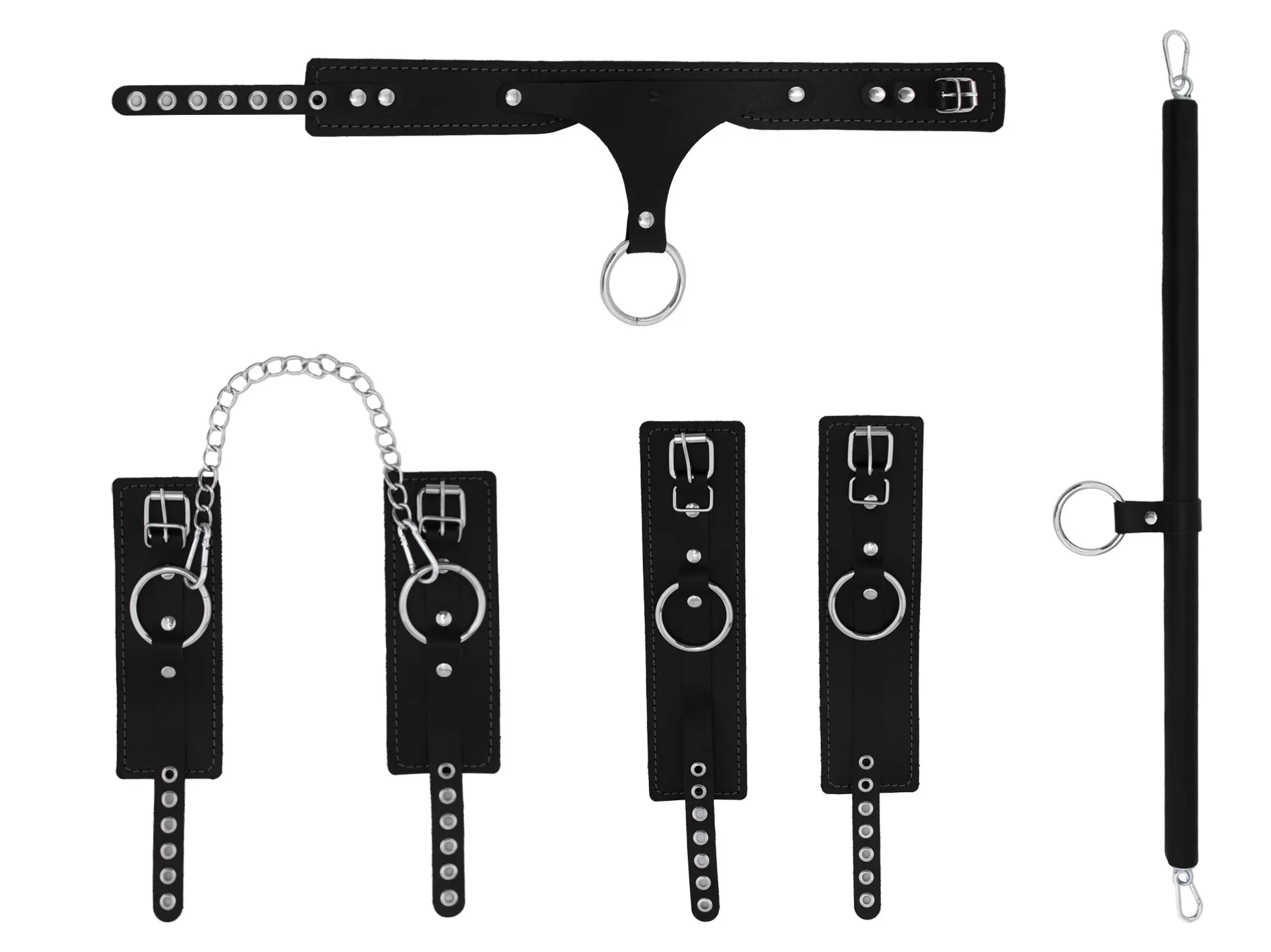 В комплект объединены несколько девайсов, чтобы ваши игры были максимально интересными: ошейник, наручники и оковы на ноги c распоркой. Все элементы имеют крепления в виде 6 карабинов и колец, куда их можно присоединить.