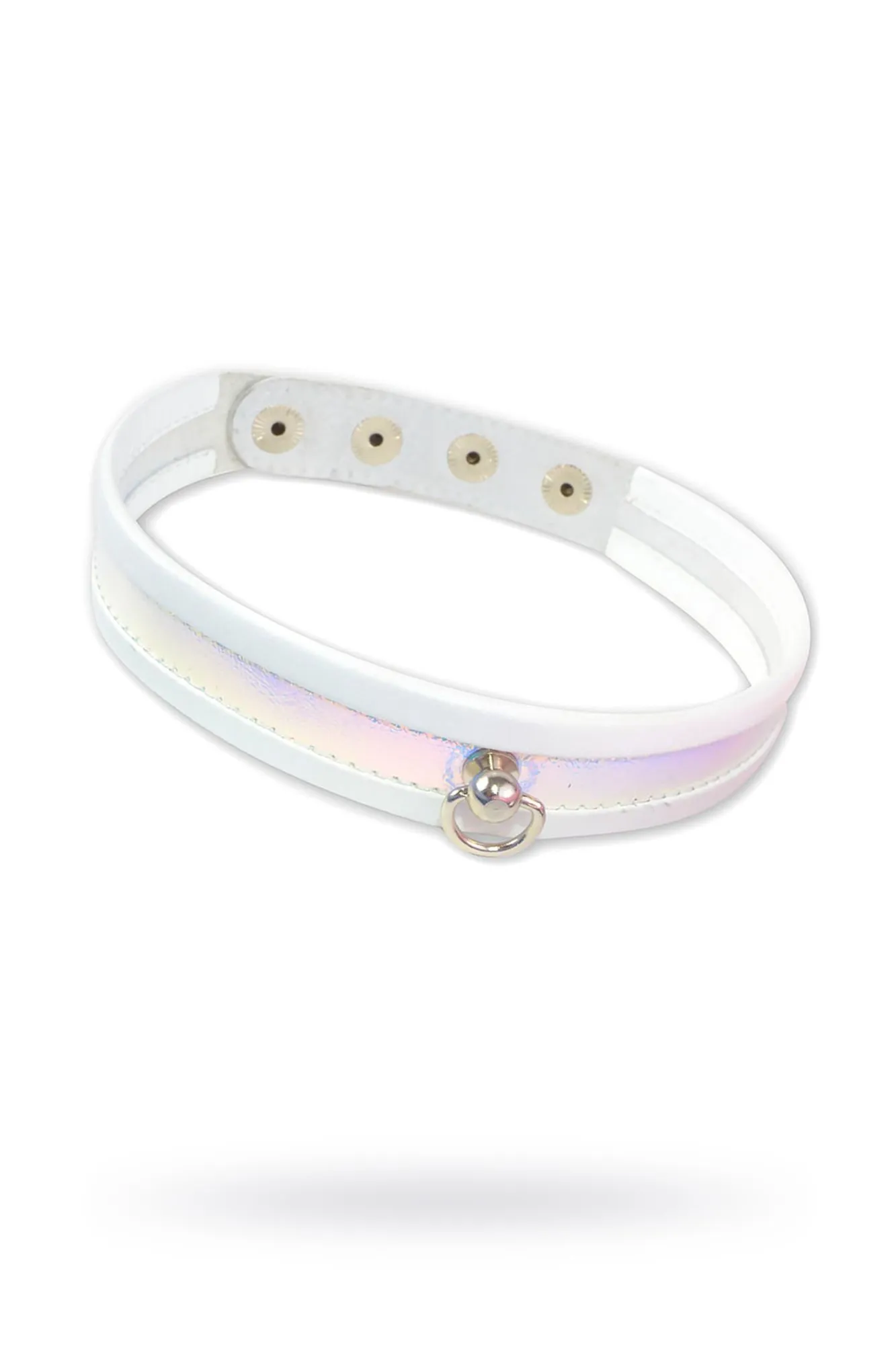 Белоснежный сверкающий узкий ошейник от Sitabella подойдёт, как для «ванильных» ролевых развлечений, так и для сессий BDSM. Узкий, аккуратный он плотно и комфортно прильнёт к Вашей шее. Скруглённые края ошейника придают ему рельефность, объёмность, а самое главное, не позволяют врезаться в нежную кожу шеи. Особенность данного ошейника в том, что он декорирован голографической вставкой, которая переливается нежными тонами: розовым, голубым, серебристым, сиреневым. Помимо собственных оттенков ошейник отражает окружающие цвета, что делает его колорит ещё богаче. Ошейник изготовлен из натуральной белой кожи и имеет кнопки с никелевым покрытием, для регулировки размера изделия на теле. В центре передней части ошейника имеется небольшое полукольцо для поводка. Ширина ошейника 2 см. Длина 41 см.