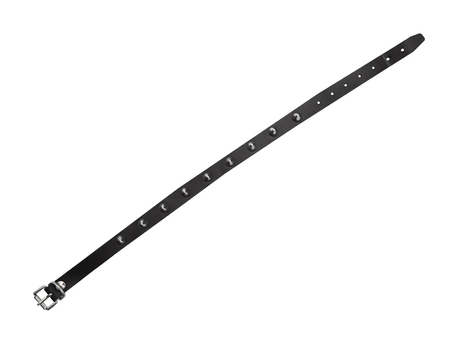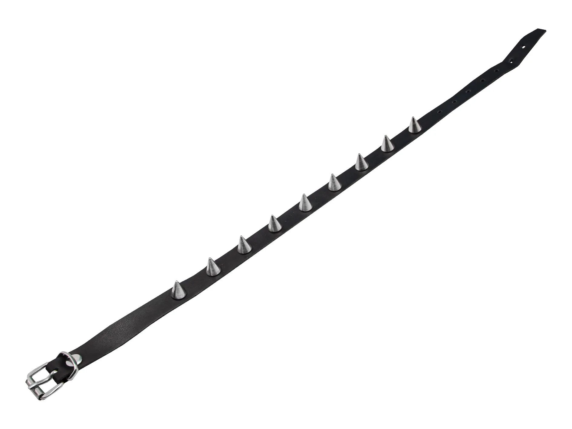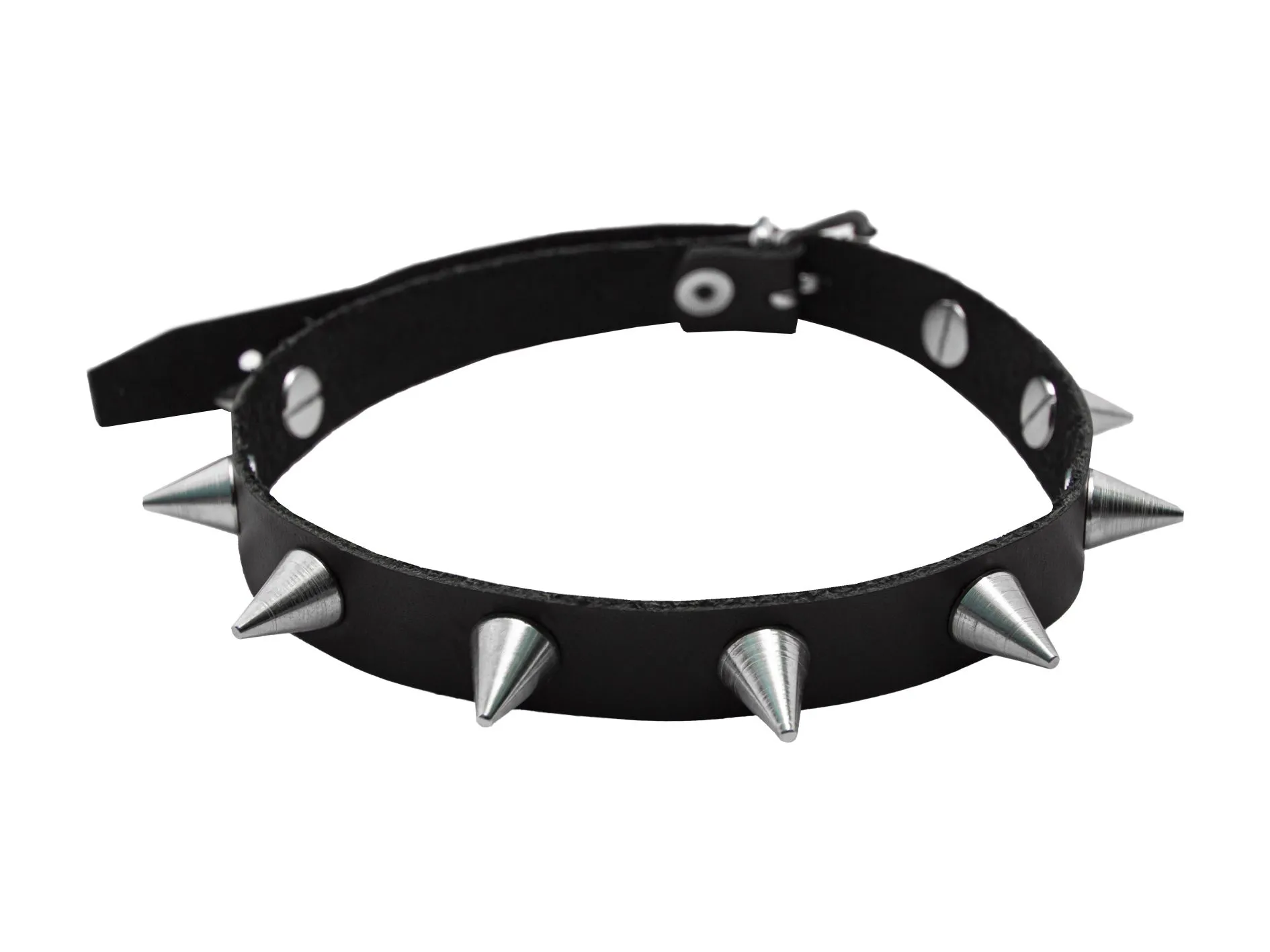 Ошейник выполнен из натуральной кожи высокого качества и декорирован металлическими шипами. Застегивается на ремешок с пряжкой. Изделие без подкладки.