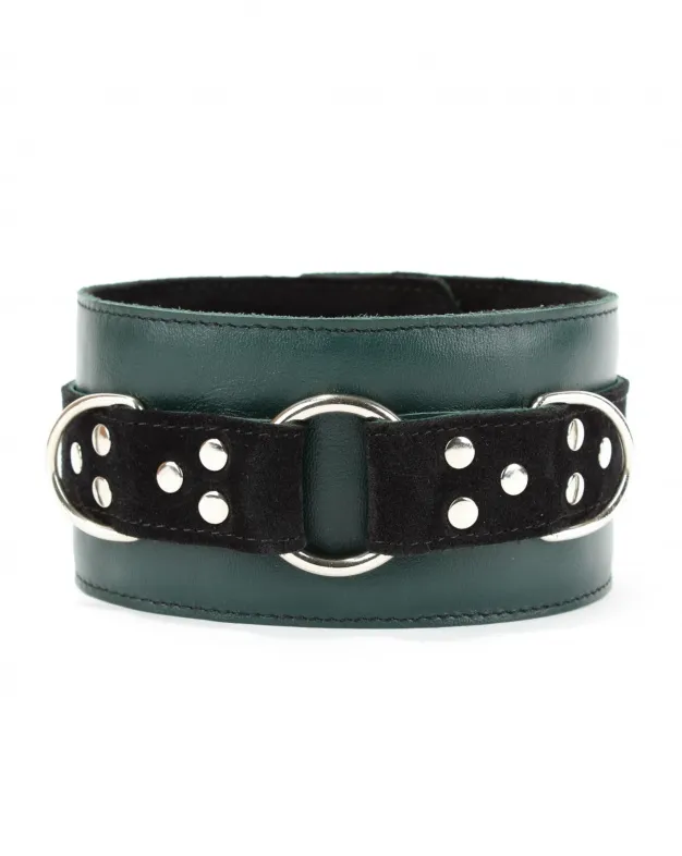 Ошейник выполнен из натуральной кожи изумрудного цвета, декорирован вставкой из черной замши, заклепками, металлическим кольцом и двумя полукольцами. Сзади аксессуар надежно фиксируется пряжкой, ремень позволяет выбрать нужный размер. Мягкий подклад из замши обеспечит комфортное пребывание в аксессуаре.