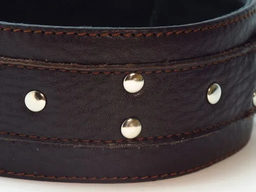 Ошейник выполнен из качественной натуральной коричневой кожи, мягкий и комфортный в использовании. Впереди находится сварное полукольцо. Ширина ошейника 5см, ширина ремешков 3см.Аксессуар декорирован металлическими заклепками, фиксируется ремнем сзади, удобно регулируется длина, подойдет на обхват от 30 до 38см.Стильный аксессуар поможет воплотить эротические фантазии в реальность. Материал: натуральная кожа, металл Цвет: коричневый