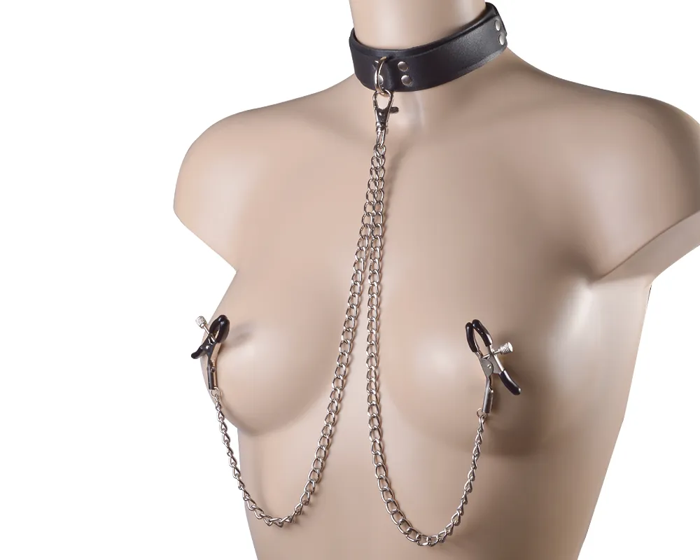 Ошейник с зажимами на соски изготовлен из натуральной кожи с применением никелированной фурнитуры, декорирован клепками. Регулируется ошейник при помощи пряжки, что позволяет оптимально подобрать размер. Зажимы оснащены пружинным механизмом, за счет чего легко и удобно фиксируются на месте, винтики позволяют отрегулировать степень давления в соответствии с индивидуальными предпочтениями. Ширина ошейника 3 см, длина металлической цепочки 40 см. Поводок кожаный.