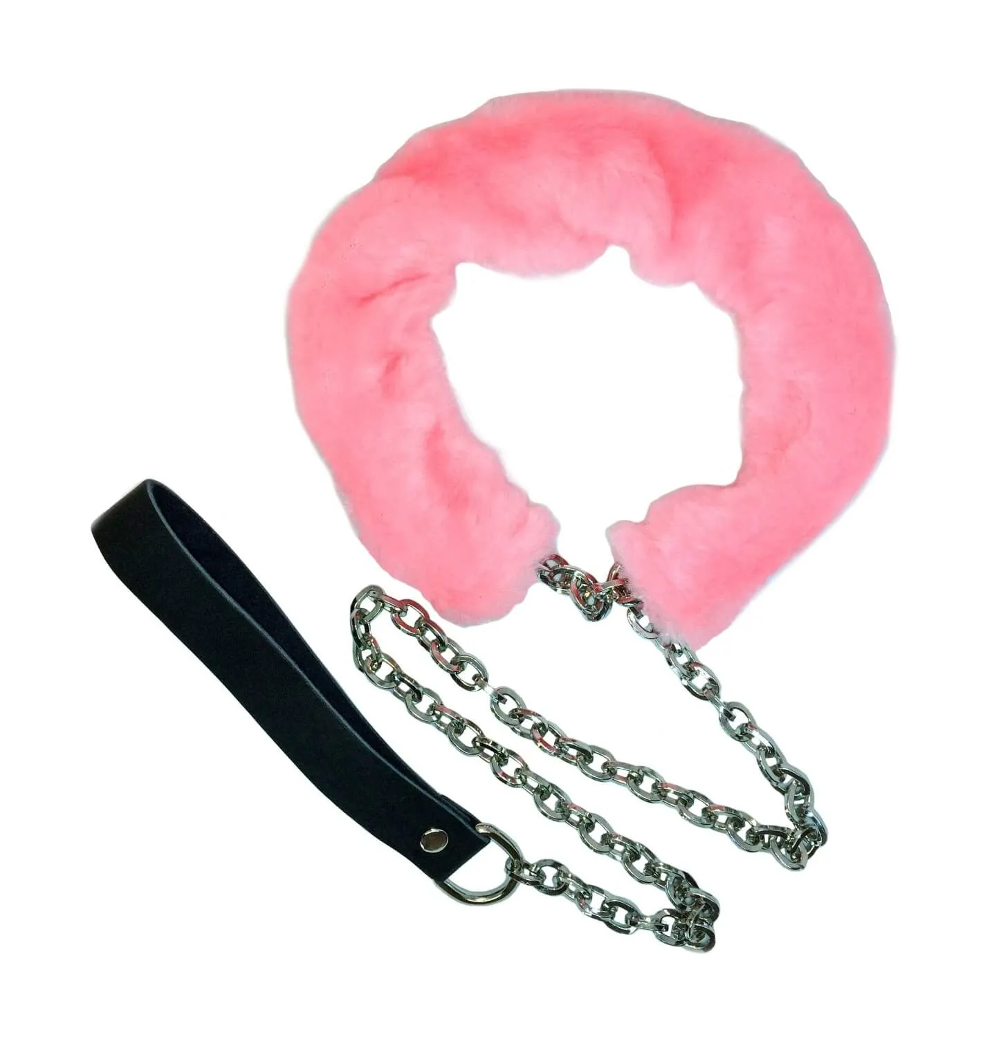 Поводок состоит из удобной ручки, выполненной из толстой натуральной кожи, и прочной стальной цепочки с карабином длиной 95 см. В качестве ошейника используется съёмная муфта из искусственного меха розового цвета, комфортно прилегающая к шее.