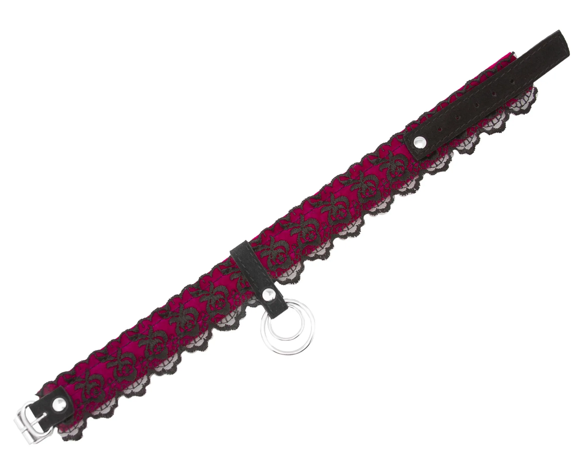 Ошейник выполнен из замши и декорирован черным кружевом. Такой аксессуар не только украсит собой шею Вашего партнера или партнерши, но и будет служить своеобразным символом подчинения. Благодаря двойному кольцу на ошейнике Вы сможете присоединить к нему поводок или другие бандажные аксессуары, чтобы поэкспериментировать с различными сценариями игры и вариантами фиксации.