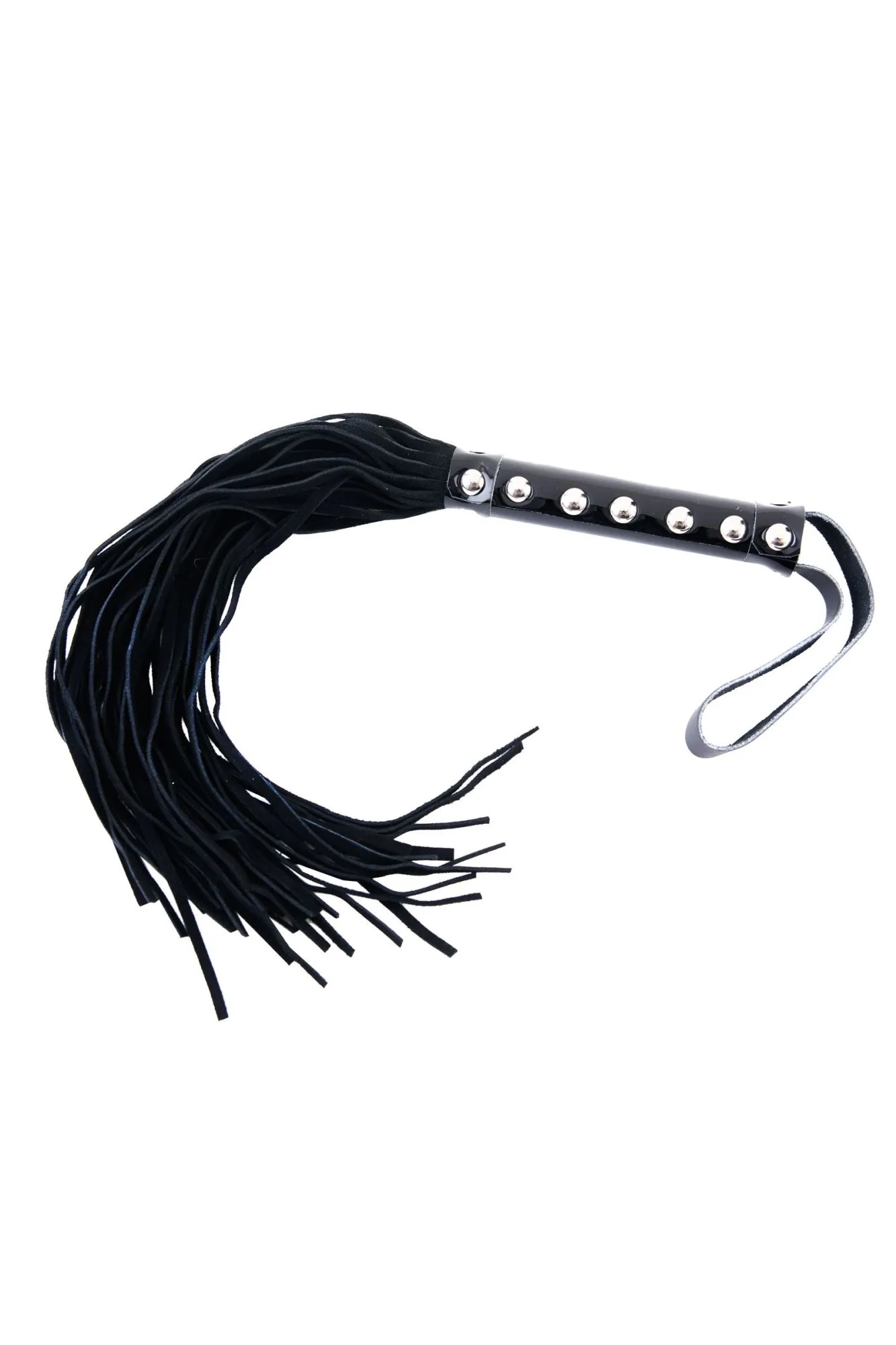 Флоггер с 40-а замшевыми хвостами и жёсткой ручкой, обтянутой лакированной кожей и декорированной блестящими заклёпками, выглядит угрожающе и невероятно стильно. Но внешняя привлекательность — не единственное преимущество этого аксессуара. Для удобства держания имеется кожаная петля, длина хвостов составляет 33 см, а длина ручки достигает 16 см. Такой экземпляр отлично подходит для разогрева и лёгких игр в наказание.