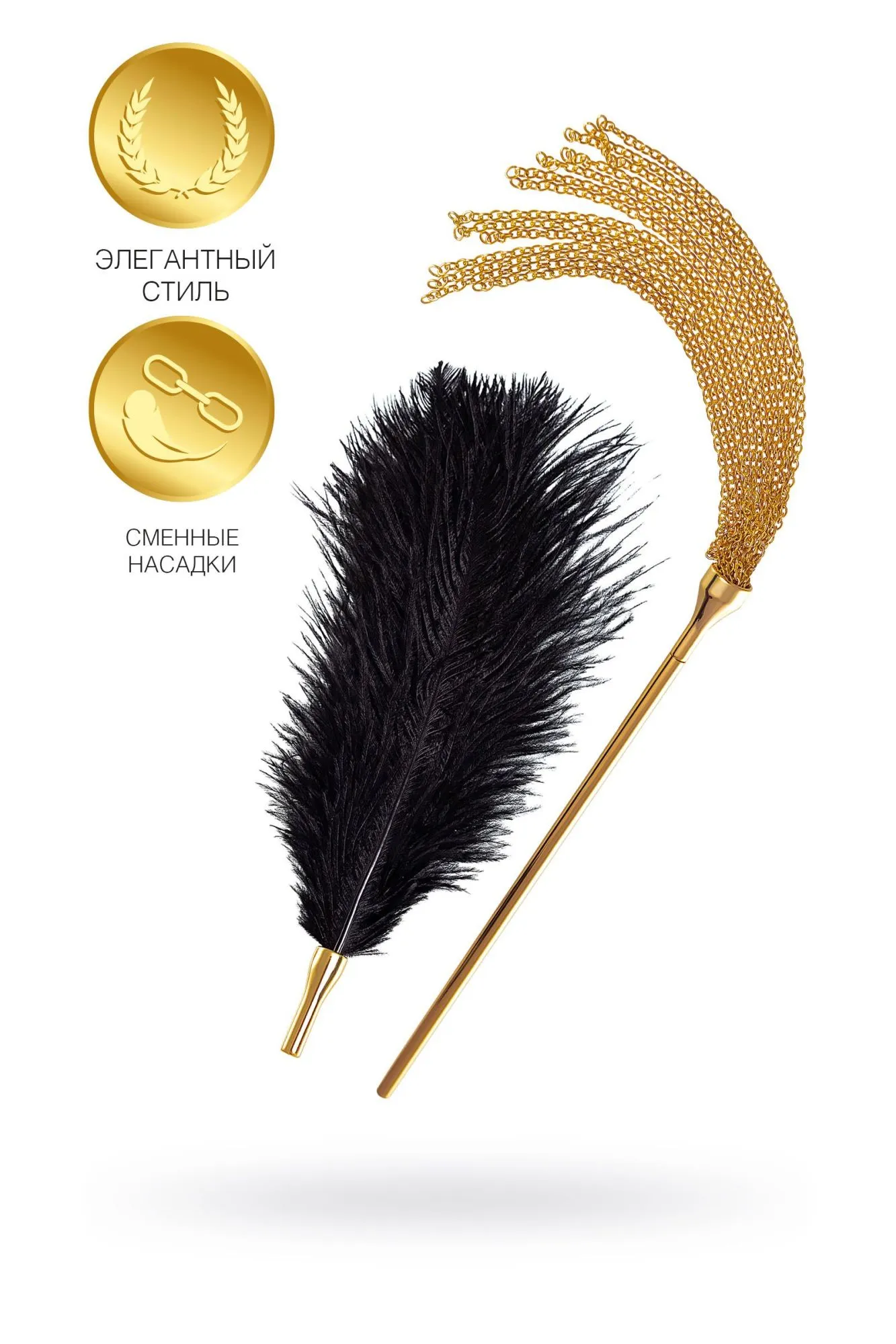Флоггер\щекоталка со сменными наконечниками БДСМ-атрибутика не обязательно всегда строгая и брутальная. Эстетика и изящные линии для утонченных образов - вот что предлагает Theatre. Флоггер и щекоталка 2 в 1 станут изысканным элементом декорации в вашей спальне. Незаменимая вещь для пробуждения эрогенных зон партнера. Можно сначала пощекотать их перышком, а потом полностью возбудить мини-флоггером из металлических цепочек. Обе насадки накручиваются на ручку длиной 20 см и легко сменяют друг друга. Роскошная гамма черного и золотого цветов, сочетание металла и нежного перышка - дразните своего партнера сменой ощущений, а затем переходите к более активным действиям! Общая длина 40\44 см Длина ручки 20 см Длина цепочек 20 см Длина пера 24 см Материал: перо, металл В фотосессии на модели использованы пэстис Theatre 705006