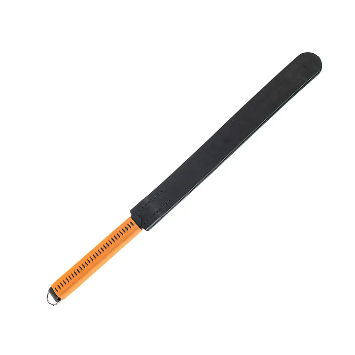 Шлёпалка сделана из натуральной кожи чёрного цвета в оригинальном дизайне с прошитой в ручную ручкой. Два язычка крепко держатся на удобной рукоятке. Наносите ей чувствительные удары по ягодицам или бедрам, которые будут сопровождаться звонкими и возбуждающими шлепками.