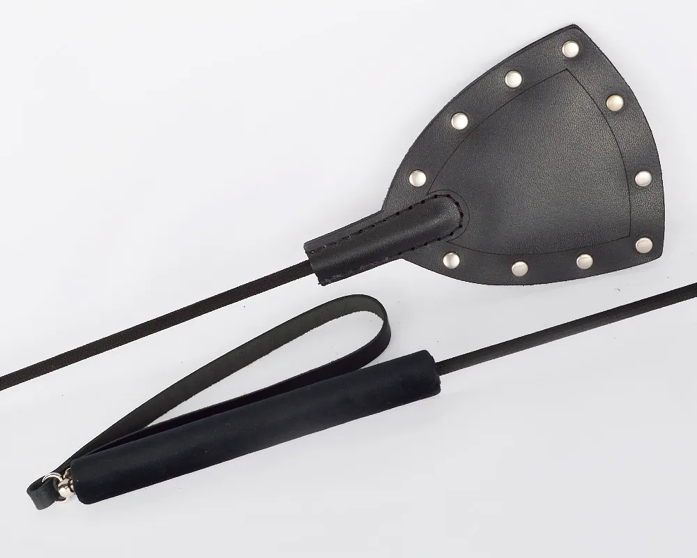 Стек и представлен в виде роскошного, изящного изделия черного цвета. Основательная хлопушка стека изготовлена из натуральной кожи высокого качества и украшена большим количеством клёпок. Хлопушку и рукоять соединяет упругий, но прочный хлыст. Ремешок-пет