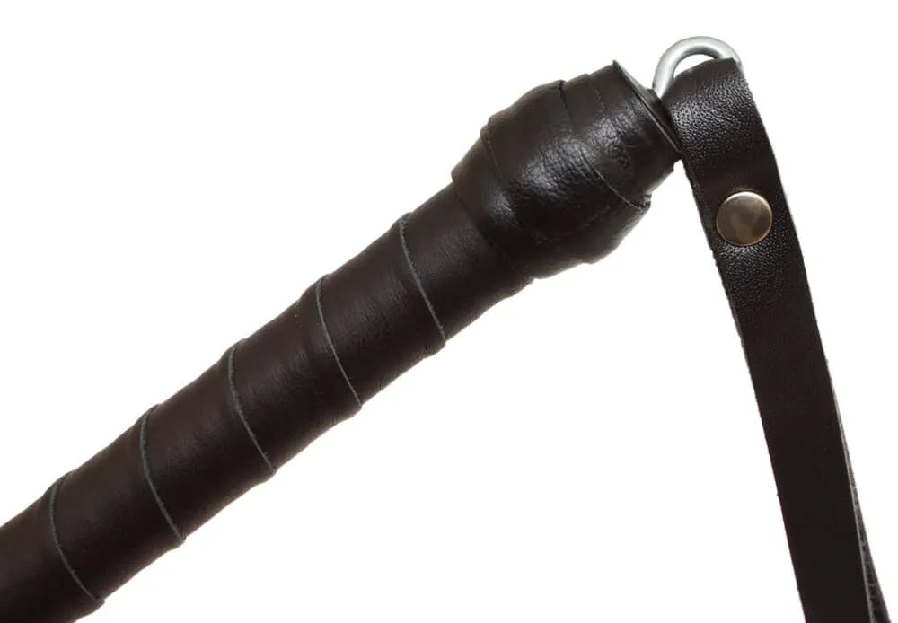 У этого стека гибкое основание, овитое черными лакированными полосками, и наконечник в виде хлопушки длиной 10 см. Также у стека есть удобная рукоять с петлей для надевания на руку.