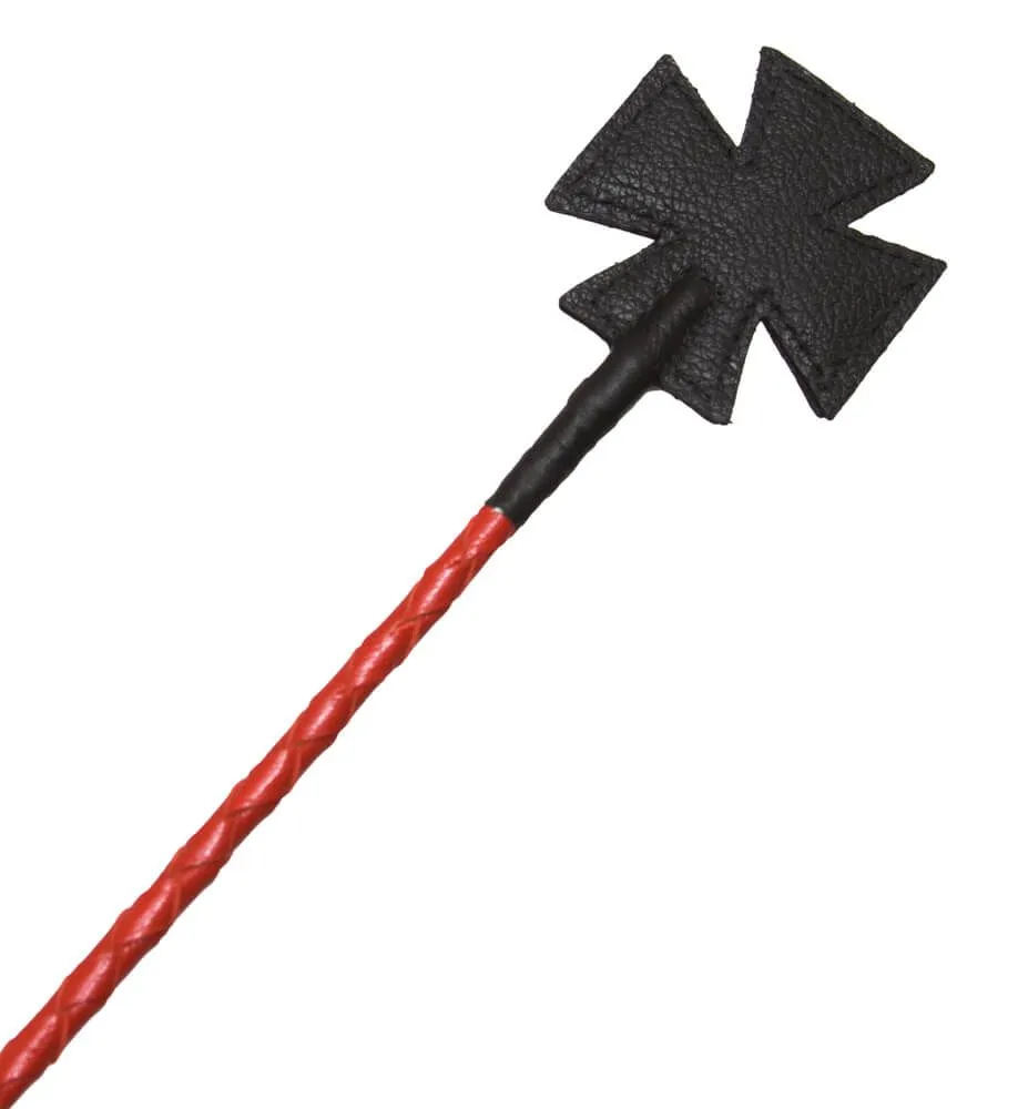 Стек длиной 70 см состоит из гибкой основы, овитой натуральной лаковой кожей красного цвета, наконечника в виде креста длиной 10 см и удобной рукояти с петлей для надевания на руку. Осторожно наносите удары, чтобы не повредить кожу узлом, с помощью которого наконечник крепится к телу стека.