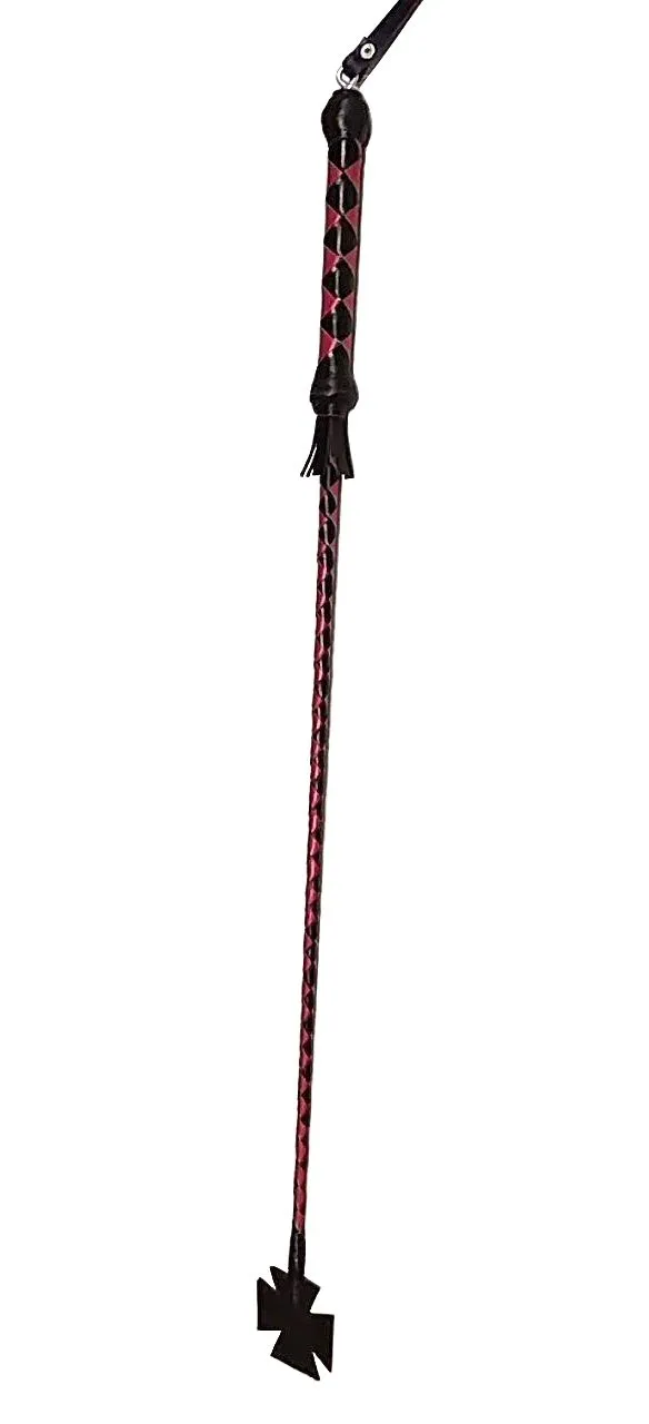 Стек длиной 70 см состоит из гибкой основы, овитой натуральной лаковой кожей черно-красного цвета, наконечника в виде креста длиной 10 см и удобной рукояти с петлей для надевания на руку. Осторожно наносите удары, чтобы не повредить кожу узлом, с помощью которого наконечник крепится к телу стека.