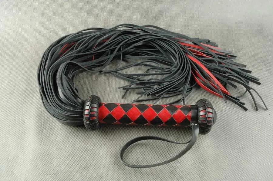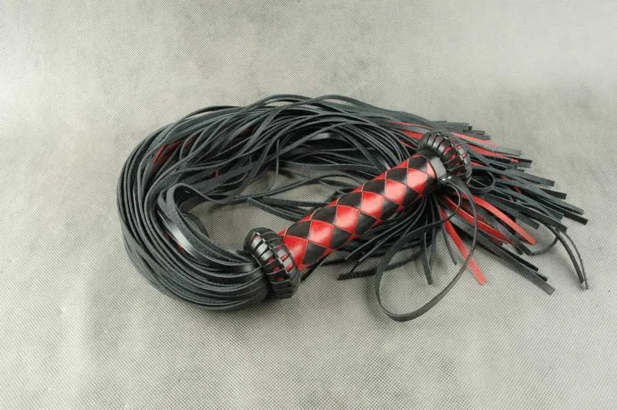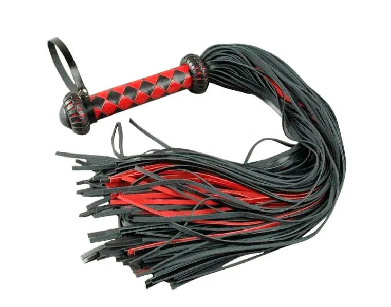 Плеть "Грешница" от бренда Beastly состоит из 115 полос с прямым резом на концах и плетеной рукояти, украшенной ограничителями в виде "фонариков." Такой аксессуар позволит Вам со всей страстью наказать своего партнера и преподать ему пару уроков послушания. Плеть сделана из натуральной кожи черного и красного цветов средней жесткости. На рукояти, плетенной 6 широкими полосами ромбом, есть петля для фиксации плети на запястье.