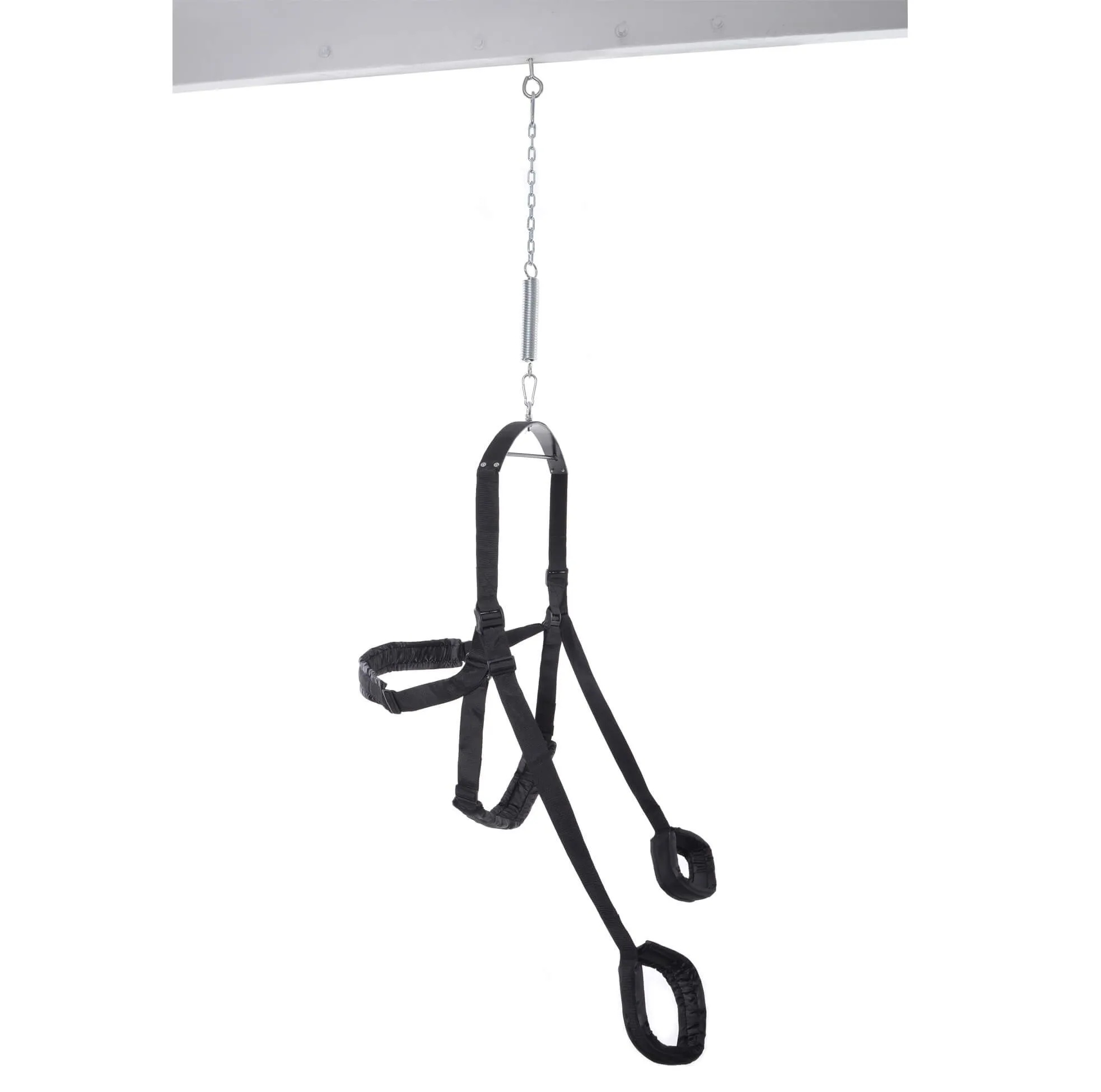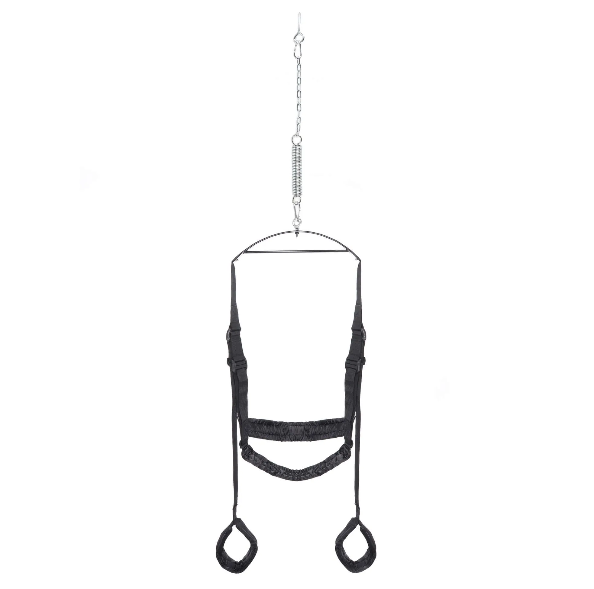 В комплект входит надежное крепление, которое можно установить как в бетонный и в деревянный потолок, так и в дверной проем, если он достаточно прочный. Установка производится легко и быстро с помощью обычного набора инструментов. К изделию прилагается инструкция. В комплект качелей входят: стальное ушко-болт, цепь, пружина, стальная поддержка, мягкая подставка под ягодицы и спину, стремена, крюки для крепления, сатиновая маска.