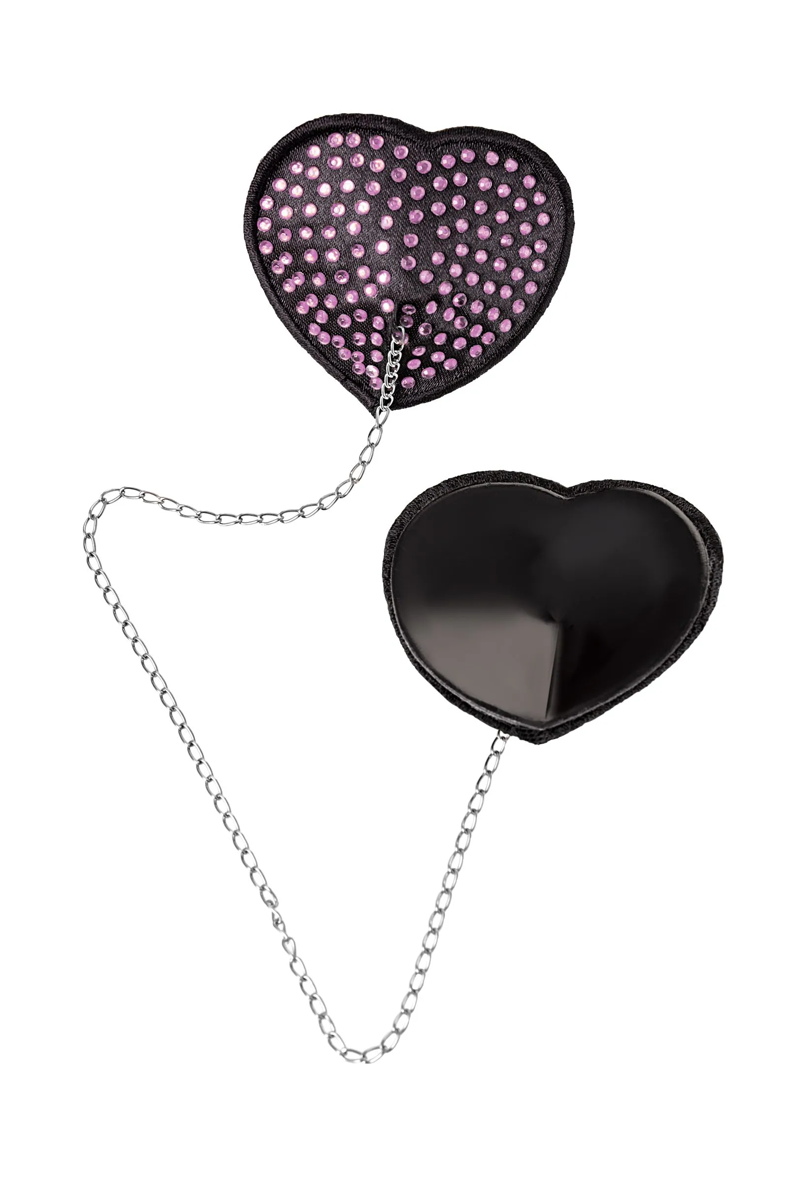 Наклейки на соски многоразовые. Конус выполнен из полиуретана, внутри — слой силиконового геля. Декор: сатин со стразами и серебристая металлическая цепочка. Размер основания: 5 см. Длина цепочки: 28 см. Наклеивать на чистую кожу без следов косметических средств. Снимать осторожно. После использования внутреннюю сторону промыть теплой водой. Хранить, изолировав клейкий слой пленкой или приклеив к стеклянной поверхности (зеркалу). Не использовать при гиперчувствительности к силикону, нарушениях пигментации или повреждениях кожи груди.