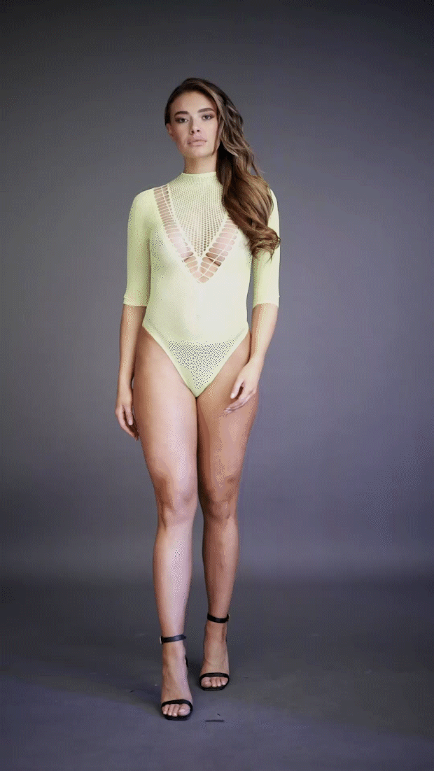 Боди в сеточку с круглым воротом и контрастным V-образным вырезом. У боди короткие рукава и круглый вырез на спине. Это боди имеет размер S-XL. Стринги не включены.
