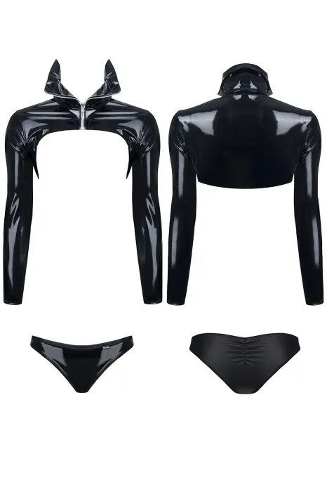 Короткий жакет открывает грудь и подчёркивает её окргулость. Полностью изготовлен из блестящей черноой и лакированой экокожи. Отлично подъходит для эротических игр в стиле БДСМ. Застегивается спереди на серебристую молнию с декоративной собачкой. В комплект Nora также входят трусики, которые дополняют куртку. Передняя часть выполнена из черной блестящей экокожи, задняя часть из матовой черной экокожи. Трусики идеально дополняют жакет и в целом образ доминирующей женщины.