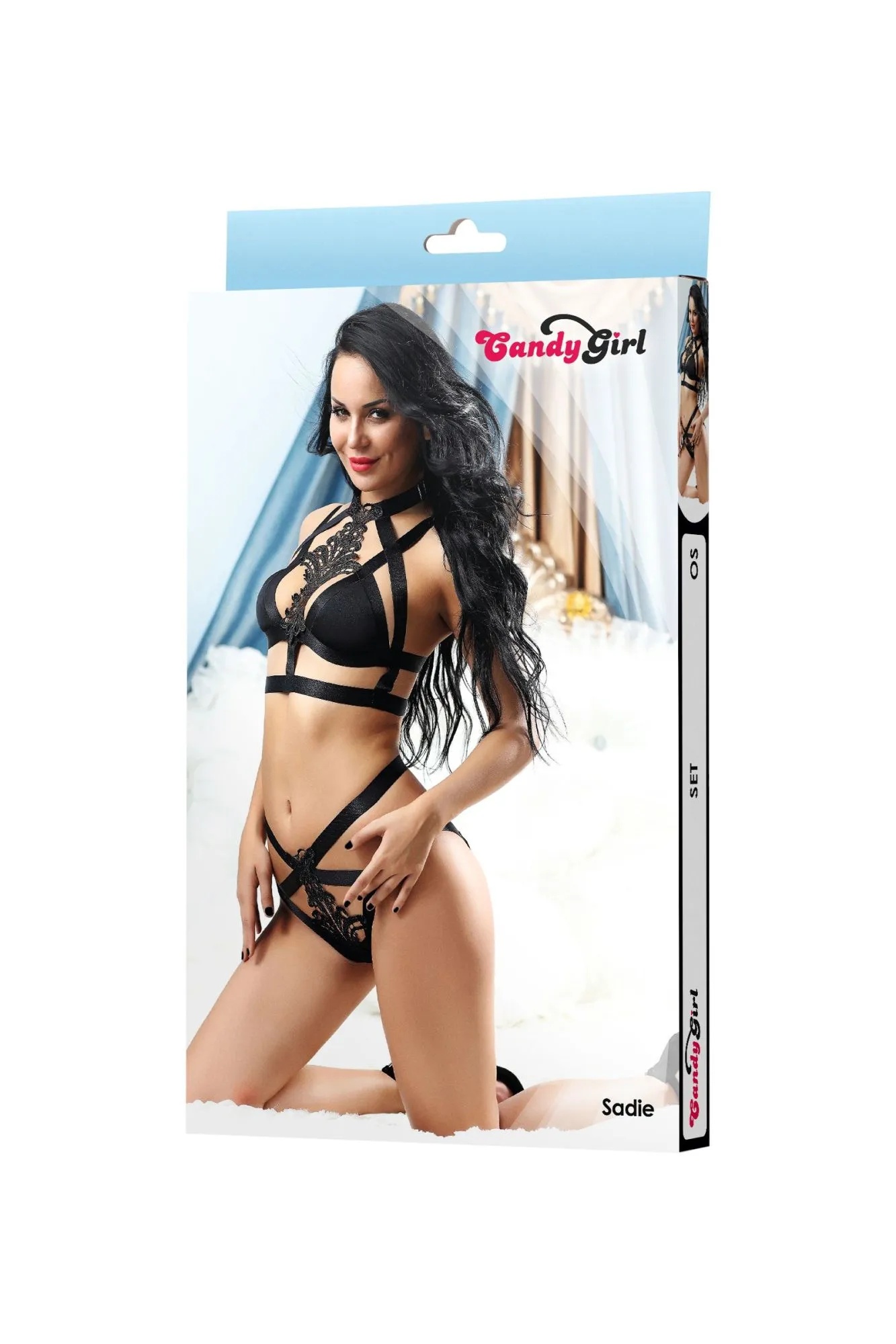 Шикарный комплект Candy Girl® Sadie сражает неприкрытой сексуальностью и оригинальностью. Для дерзких и уверенных в себе красоток. Мягкий бюстгальтер и трусики выполнены из широких эластичных стреп с матовыми трикотажными вставками. Эластичные ленты создают эффект бандажа. Уравновешивают комплект объемные рельефные кружевные вставки, делая образ менее роковым и более богемным. Регулируемые застежки на спине и шее с металлической фурнитурой помогают добиться идеальной посадки лифа.