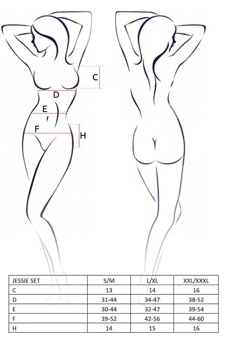 Чувственный комплект Jessie от бренда Lapin Rose состоит из бюстгальтера, трусиков-стринг и пояса с подвязками для чулок. Белье сделано из тонкого кружева с цветочным узором и полупрозрачного материала в мелкую сетку. Лифчик и подвязки украшены пикантными атласными бантиками. Чашки с косточками поддержат грудь и подчеркнут ее форму.