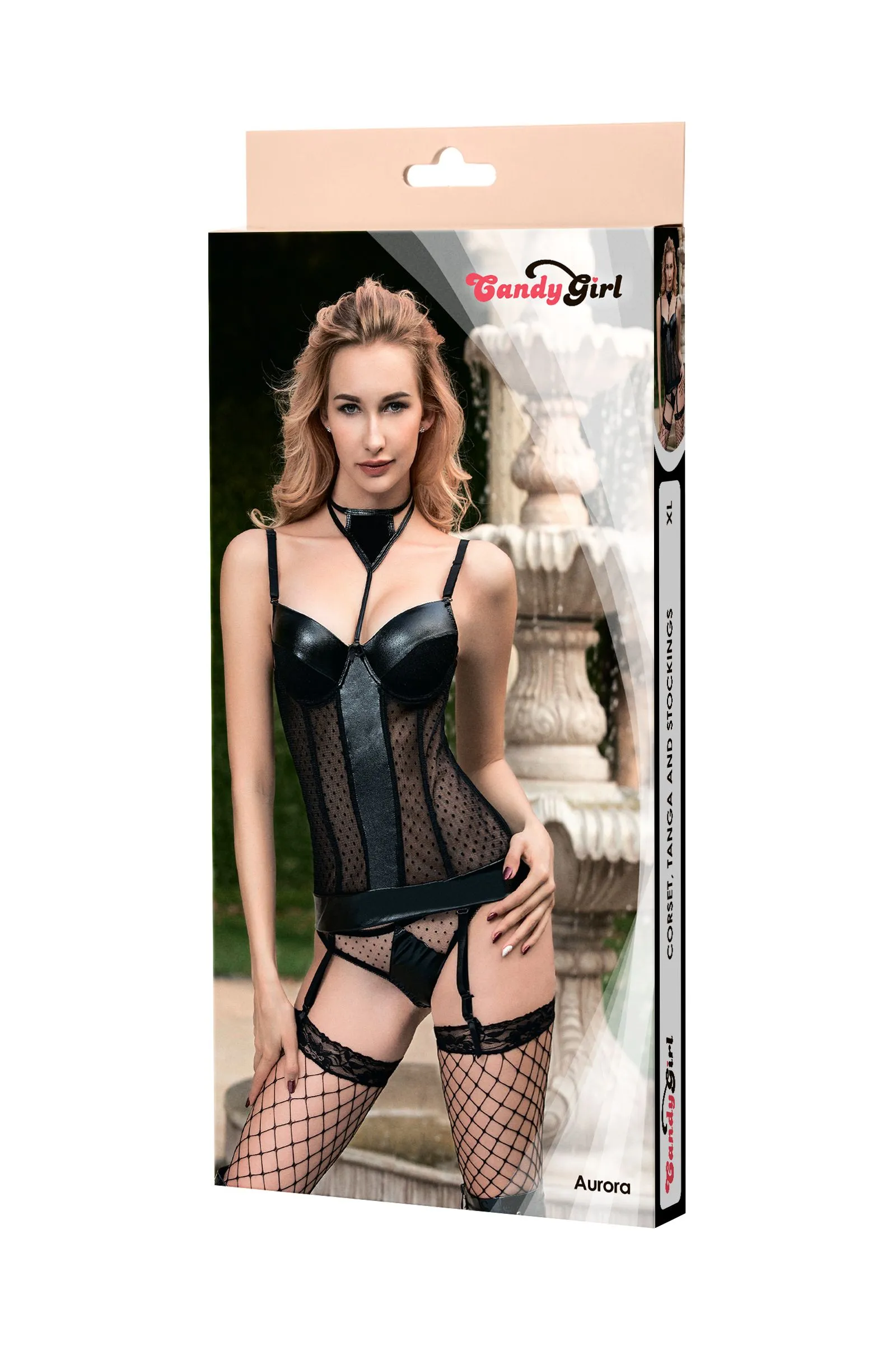 Корсет с плотными чашками Candy Girl® Aurora визуально увеличит объем груди и добавит стройности силуэту благодаря продольным косточкам и съемным регулируемым пажам. Сочетание эластичной сетки, кружевного полотна с точками и ткани wetlook с тиснением «под кожу» порадует любительниц интересных фактур. Регулируемые съемные бретели и многорядная застежка на спине обеспечат идеальную посадку. Съемный пластрон, трусики-танга и чулки из крупной сетки с уплотненными мысками идеально дополнят образ.
