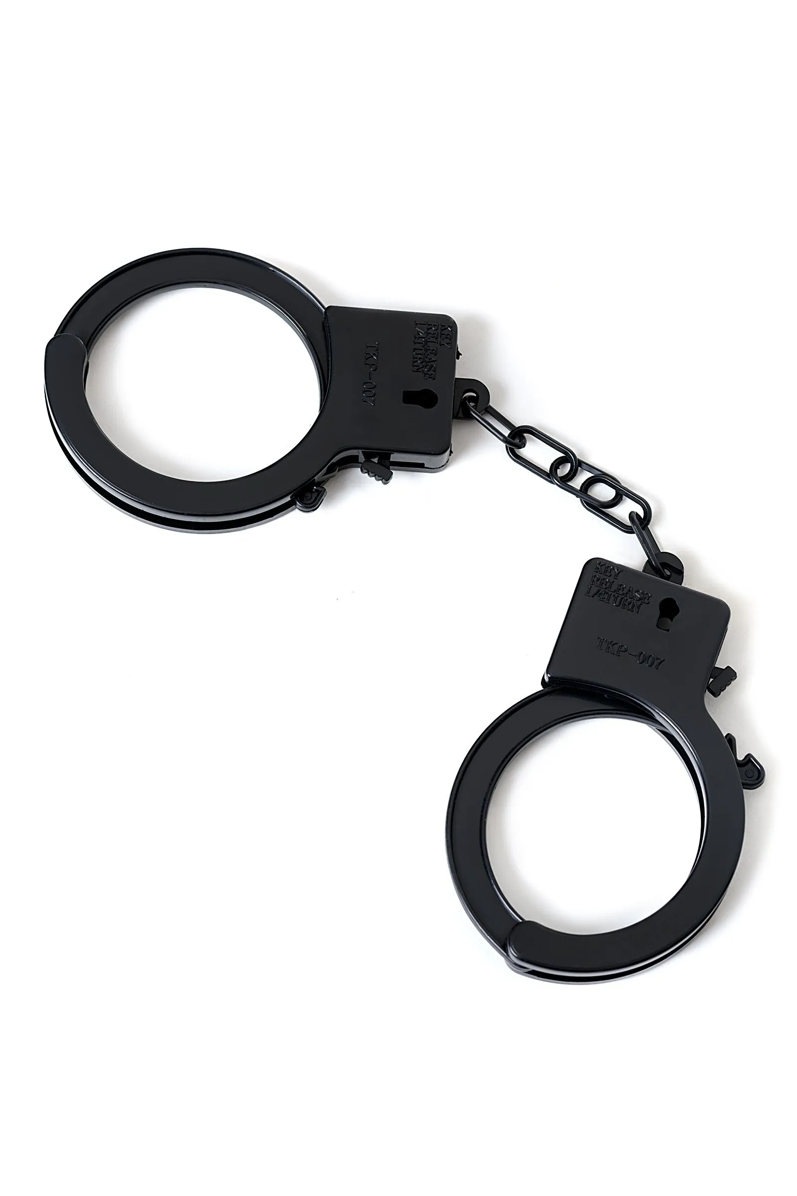Этот игровой костюм из эластичного материала wetlook с контрастными лаковыми вставками - эффектный образ для страстных натур. Стрепы, отложной воротник с манишкой на молнии и стреп-имитация чокера формируют единую деталь костюма – топ. Стрепы на трусиках привлекают внимание к бедрам. Козырек на эластичной резинке, металлические затемненные очки-авиаторы, пластиковые наручники и стреп-митенка на кнопке дополняют образ. Чулки в крупную сетку на широкой резинке с усиленными носочками входят в комплект.