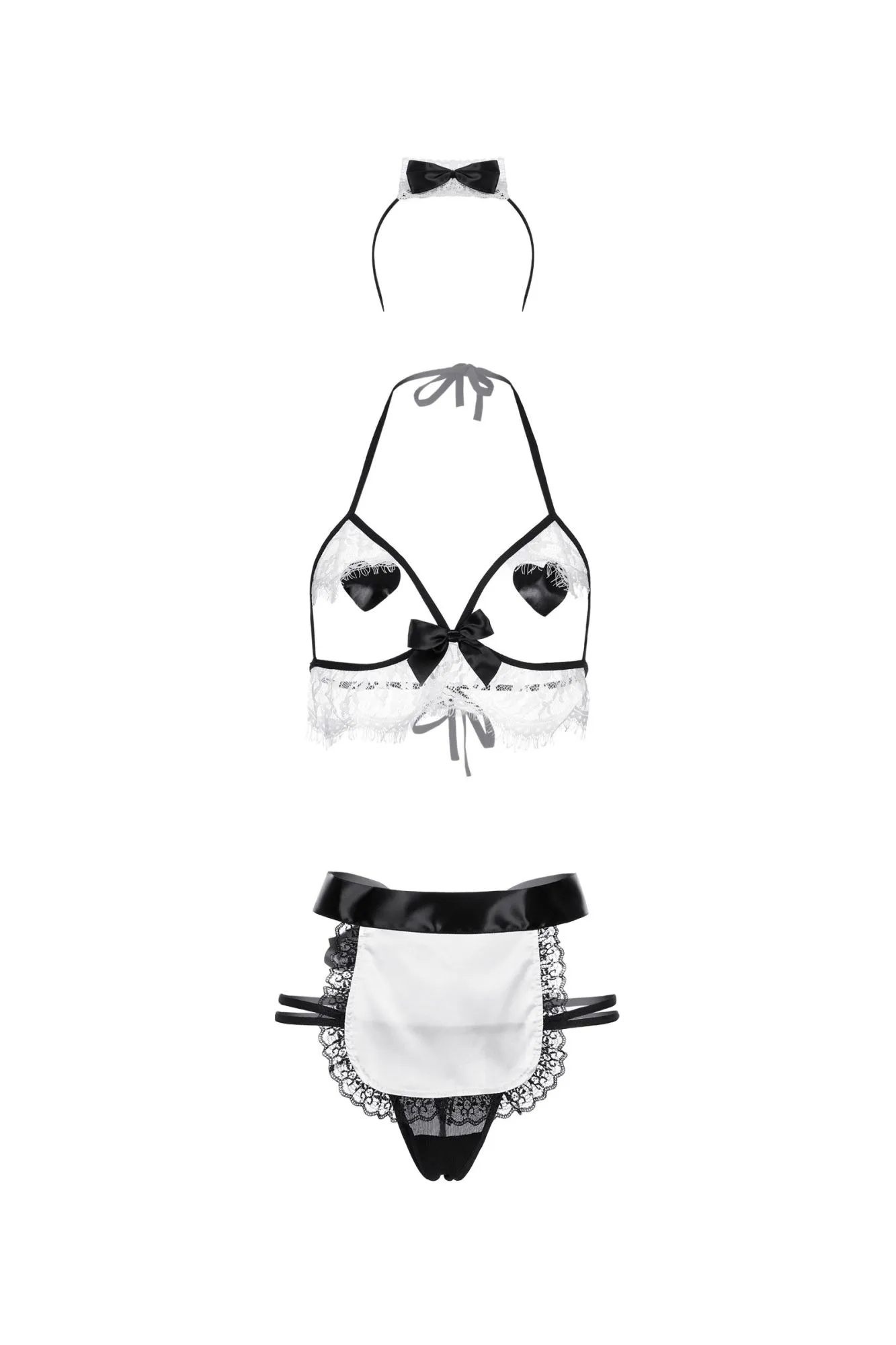 Костюм раскрепощенной горничной Candy Girl® Ciara создан специально для фривольных игр и смелых желаний. Имитация прикрытых интимных мест будоражит фантазию. Бюстгальтер на черных сатиновых завязках украшен белым воздушным кружевом. Милые акценты: пэстис в виде сердечек, игривый фартук с сатиновыми лентами, кокетливый бантик на ободке и Т-стринги - украшают тело, оставляя тебя в центре внимания.