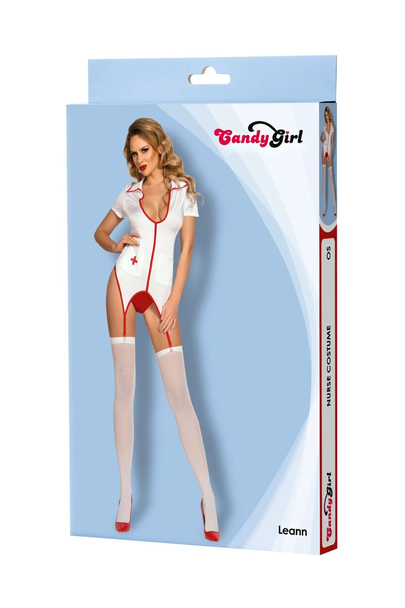Эластичный костюм медсестры Candy Girl® Leann из перламутрового трикотажа с глубоким декольте и пажами декорирован контрастной отделкой. Регулируемые пажи в паре с чулками обеспечат идеальное прилегание и натяжение по фигуре. Короткие рукава, накладные карманы, контрастные Т-стринги с ластовицей и матовые чулки с плотной резинкой завершают образ.