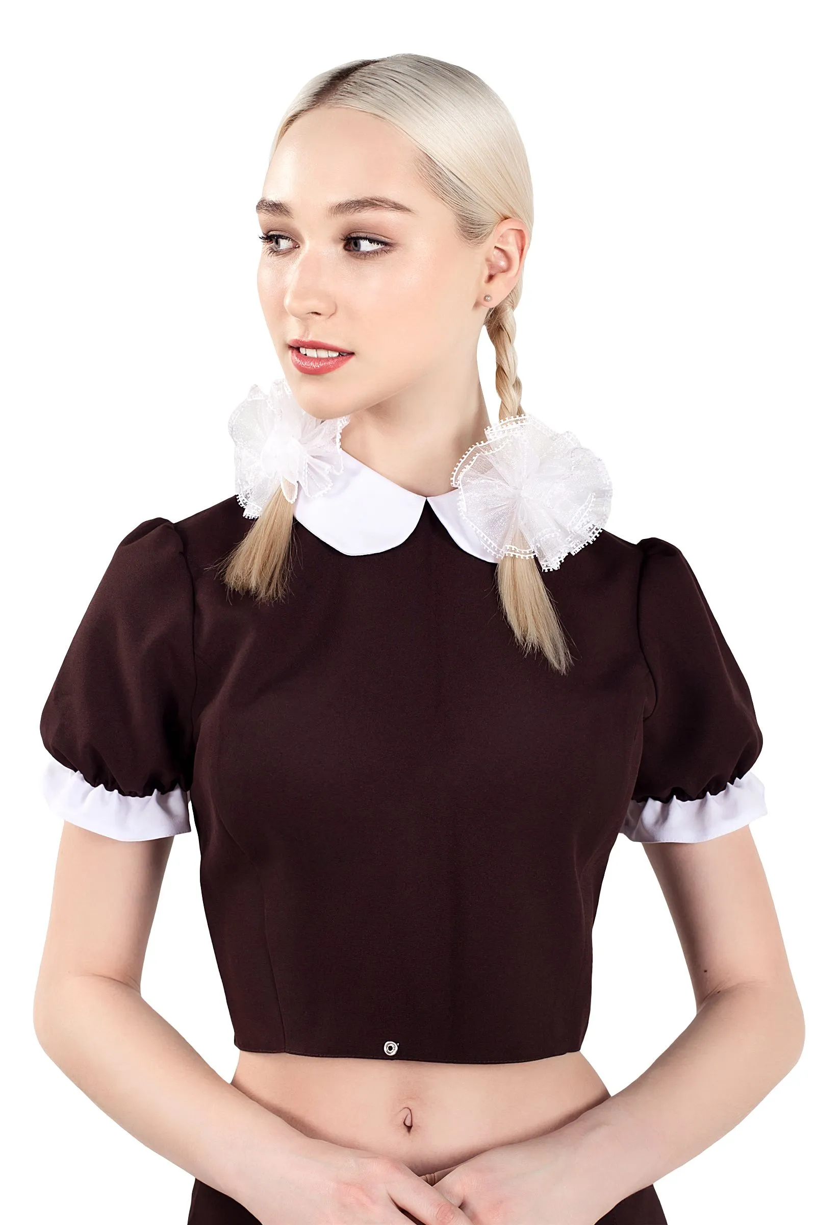 Нижняя и верхняя часть комплекта приобретаются отдельно. Именно так, Вы сможете подобрать оптимальный размер. Эротический костюм русской школьницы от Pecado создан для Ваших самых чувственных ролевых игр! Темный топ, из которого выполнена верхняя часть комплекта, состоит из полиэстера. Материал нежный, приятный, износостойкий. Топ легко и быстро надевается, фиксируется с помощью застежек сзади. Также, благодаря металлической фурнитуре, соединяется с нижней часть костюма. Кокетливый вырез на спине открывает притягательный обзор и возбуждающий полёт фантазий. Быть школьницей, готовой к любым сексуальным урокам легко! Вместе с эротическим костюмом от Pecado. ● Состав комплекта – топ, банты. ● Материал – 100% полиэстер. ● Качественная фурнитура. ● Цвет топа - коричневый, цвет бантов - белый . ● Сделано в России. ● Размерный ряд 40, 42, 44, 46 (Соответствует Российской размерной сетке).