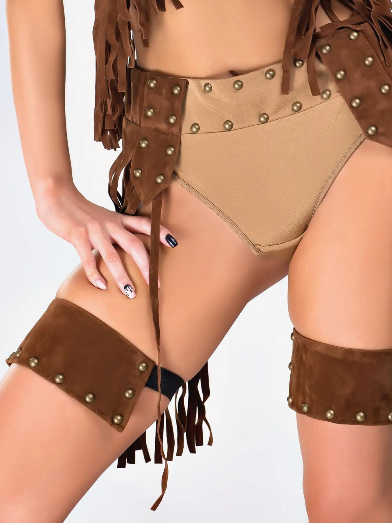 Откровенный костюм, выполненный из материала, напоминающего кожу, украшен длинной бахромой и множеством бусин. Подвязки на эластичных резинках будут соблазнительно обхватывать бедра, акцентируя на них внимание. А завершит Ваш эротичный образ ковбойская шляпа, из-под широких полей которой Вы будете дразняще и призывно стрелять глазками. Устройте безумное родео в своей спальне!