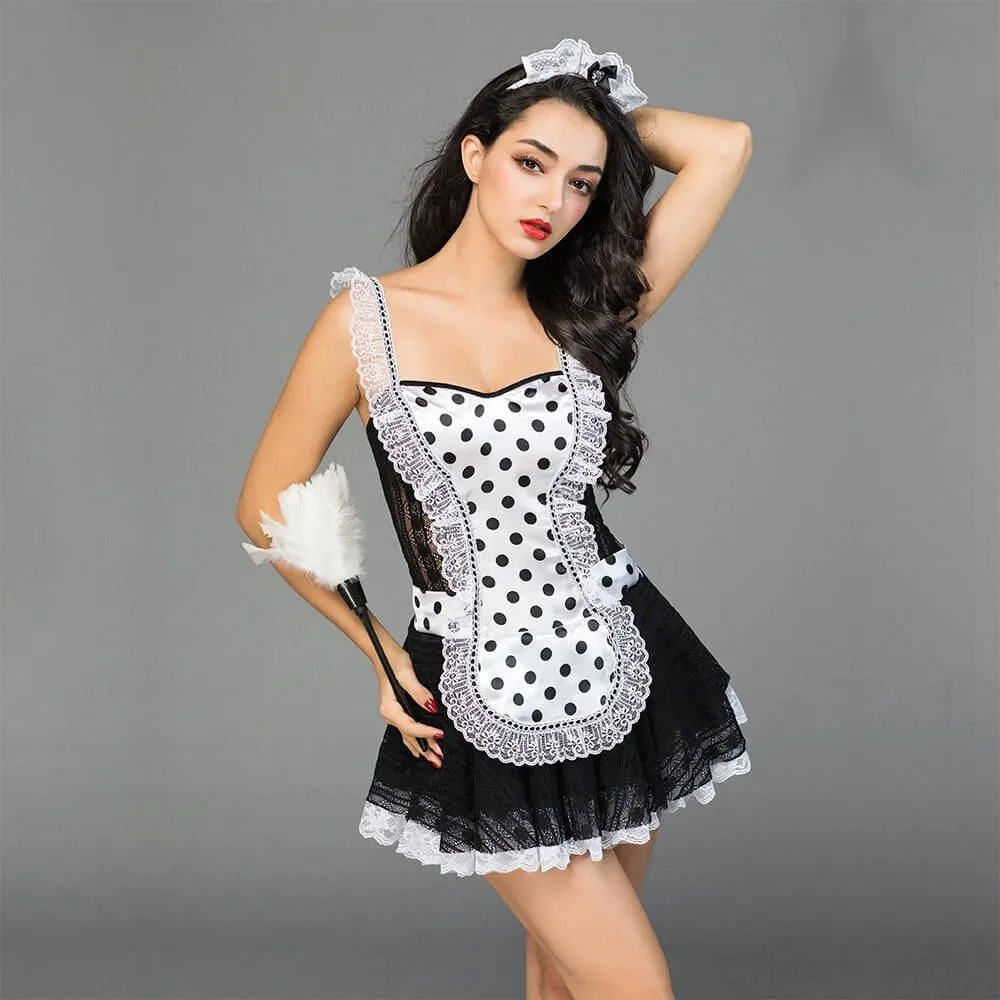 Черное платье с пышной юбкой украшено милыми оборочками и передником в горошек. Головной убор и метелочка дополнят образ и сделают его более убедительным. Метелочку из перьев можно использовать для игривого поддразнивания партнера.