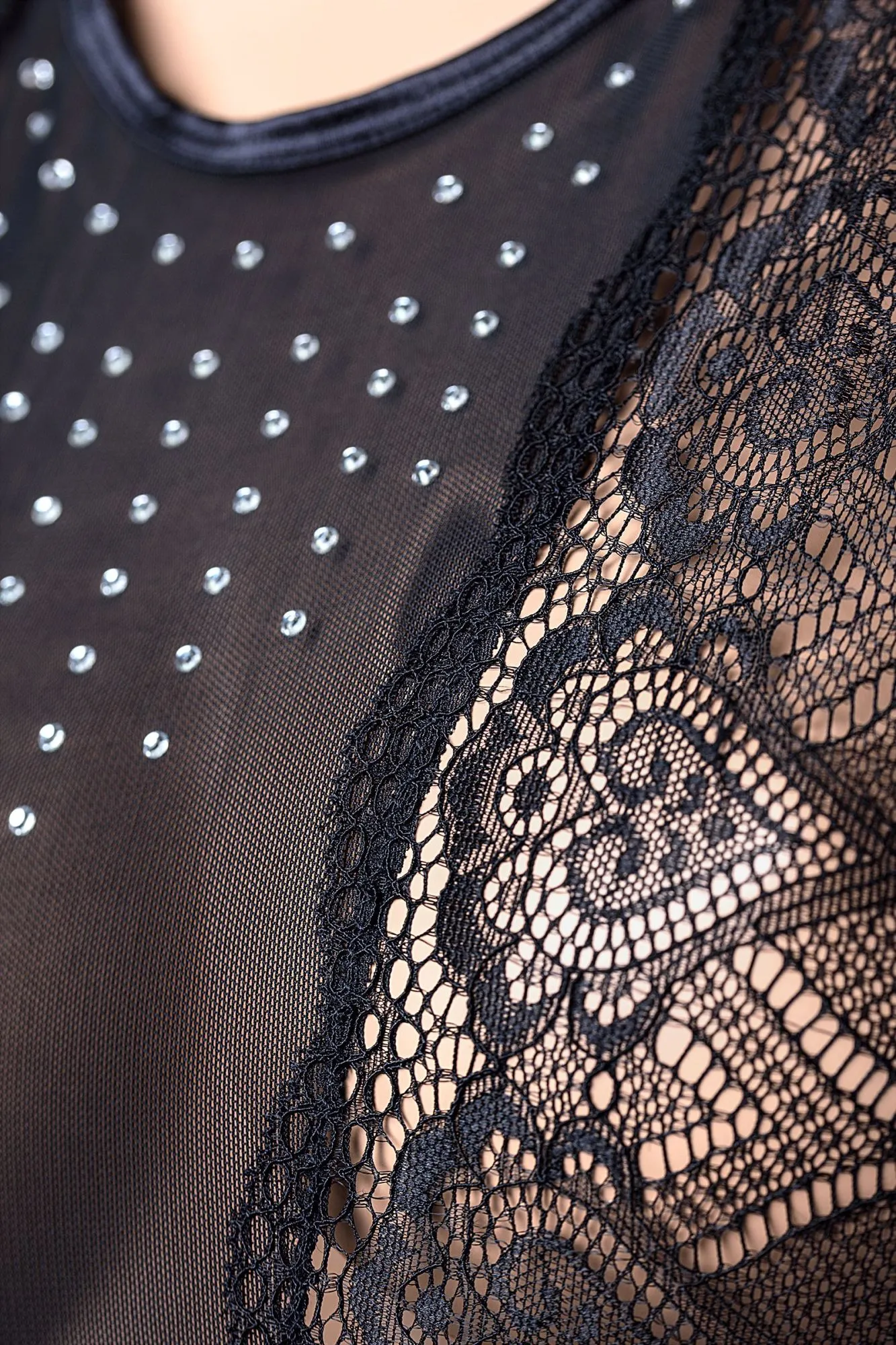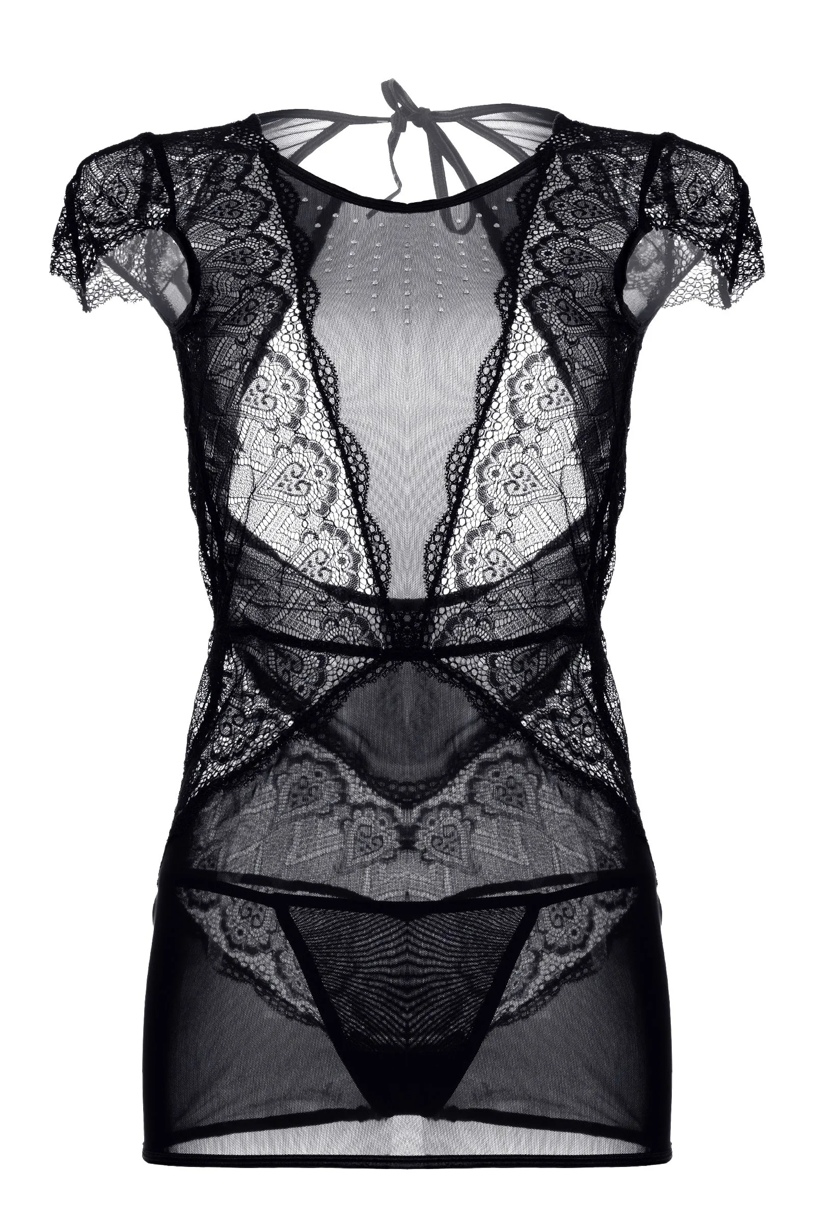 Платье Candy Girl® Estelle из эластичной сетки с шикарным рельефным кружевом, открытой спиной и миниатюрными рукавами украшено россыпью серебристых страз в зоне декольте. Продуманный дизайн визуально формирует приталенный силуэт. Завязки на шее сзади позволяют снять наряд в считанные мгновения. Т-стринги в комплекте.