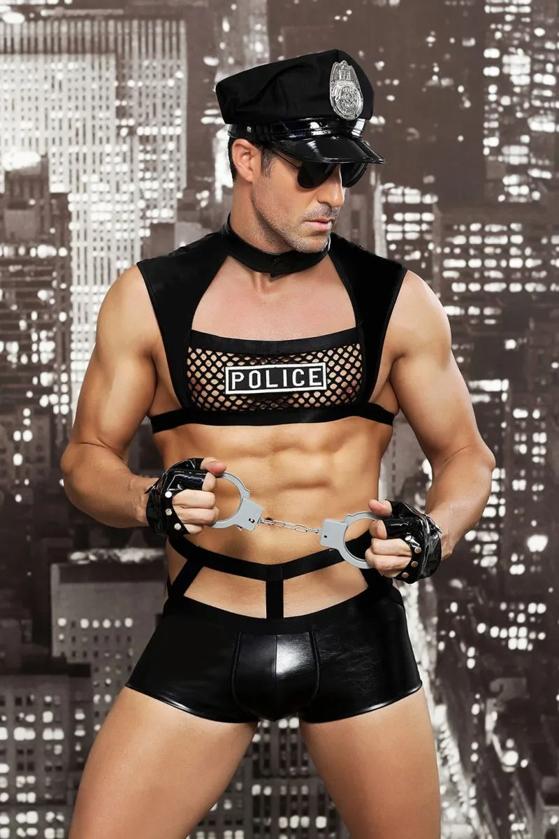 Костюм полицейского Candy Boy Davis эффектно обтянет накаченную фигуру и все выдающиеся места! Топ wetlook с надписью ''Police'', с воротником-стойкой на кнопке, с эластичными широкими стрепами и сеткой, подчеркнет кубики пресса и плечи. Боксеры wetlook с вырезом сзади привлекут внимание к ягодицам. Лаковые митенки на регулируемых кнопках, настоящие затемненные очки, головной убор с надписью ''City Police'' и пластиковые наручники идеально дополнят образ.