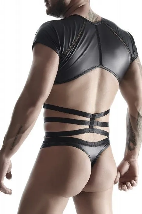 Мужская футболка из экокожи в сочетании с декоративными элементами из чёрных резинок и металлических колец серебристого цвета. Практически не скрывает ваше прекрасное тело, только выгодно подчёркивает форму мужского торса. Спереди и сзади тонкие вертикальные вставки из эластичной сеточки. Мягкая и приятная на ощупь. Все швы с укрепляющей строчкой.