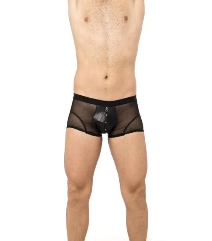 Мужские боксеры от бренда Lapin Rose сделаны из интересного сочетания натуральной кожи черного цвета и прозрачной микросетки. В области паха они декорированы металлическими клепками, придающими их виду большей эффектности. Трусы будут прекрасно облегать бедра, при этом акцентируя внимание на возбуждающем бугорке. Сзади тонкая перемычка проходит вдоль ягодиц, прикрытых легчайшей тканью. Если Вы хотите удивить свою возлюбленную, то подобное нижнее белье подойдет для такого случая.
