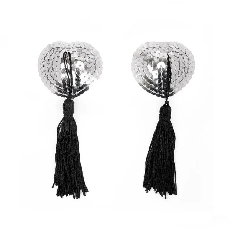 Серебристые пестисы на грудь в форме сердечек с пайетками и кисточкой. Добавят изюминку в любовную игру, украсят соски, сделав грудь привлекательной и манящей. Внешняя сторона изделий отделана пайетками. На внутренней имеется специальный силиконовый слой, за счёт которого аксессуары держаться на сосках.