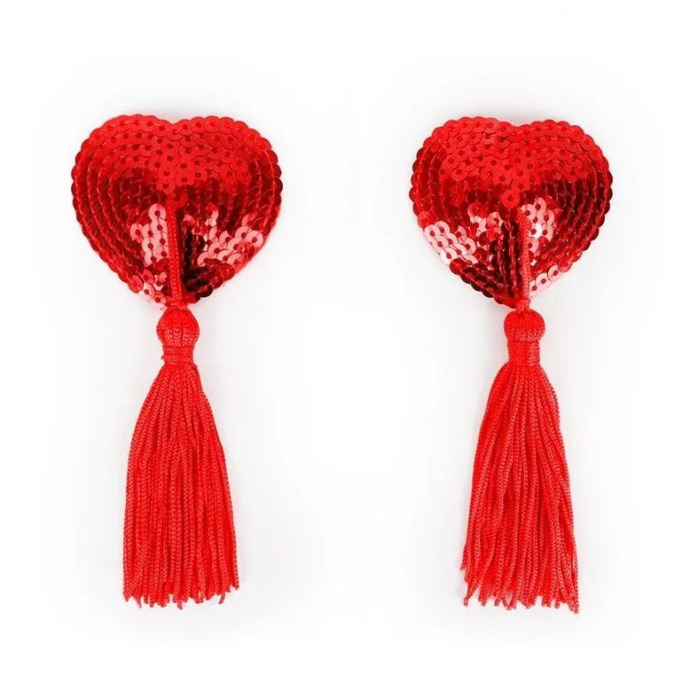 Красные блестящие пестисы на грудь в форме сердечек с пайетками и кисточкой. Добавят изюминку в любовную игру, украсят соски, сделав грудь привлекательной и манящей. Внешняя сторона изделий отделана пайетками. На внутренней имеется специальный силиконовый слой, за счёт которого аксессуары держаться на сосках.