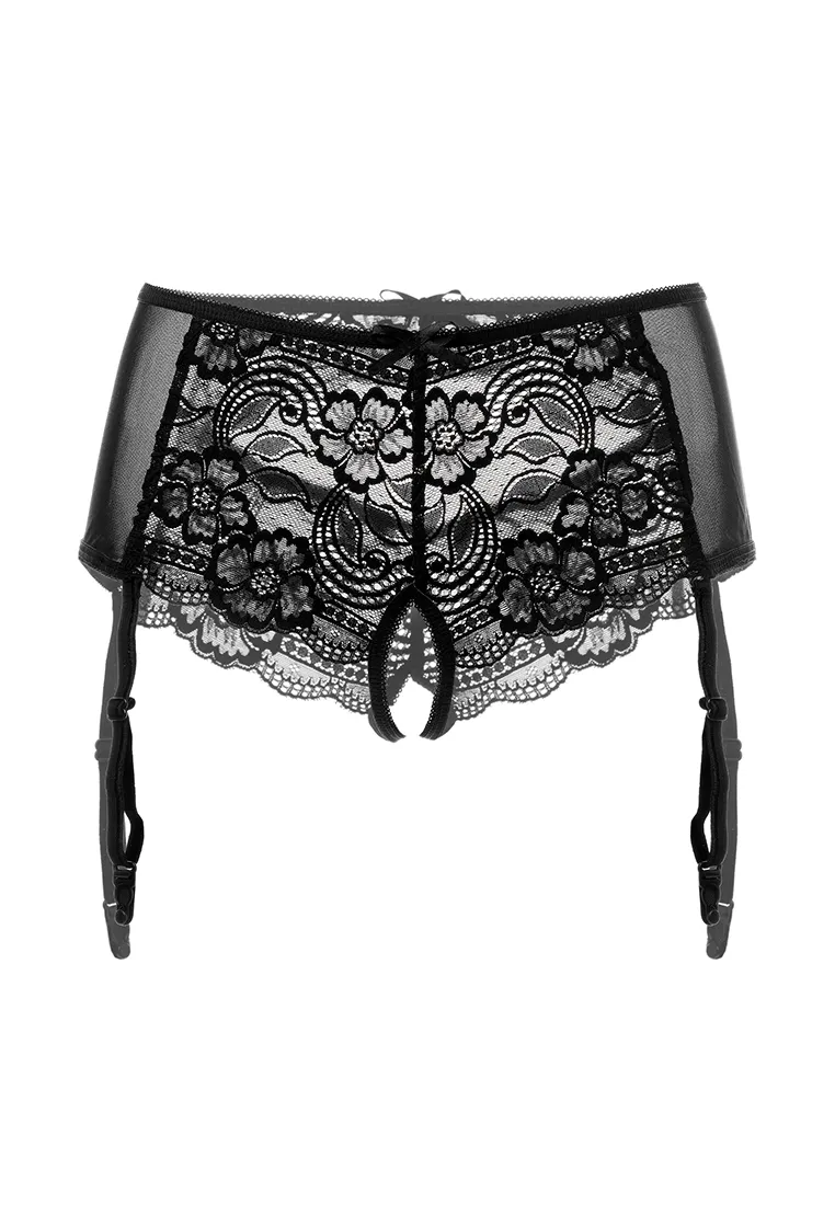 Эротические трусики-пояс Erolanta® Sheila, эластичные, из стрейч-сетки со сложными кружевными вставками, с вырезом сзади, без боковых швов, с атласными бантиками. Съемные регулируемые пажи. *Допускается замена кружева на аналогичное. Чулки в комплект не входят. На видео трусики Erolanta® Sheila дополнены идеально сочетающимся бралетт Erolanta® Marisa.