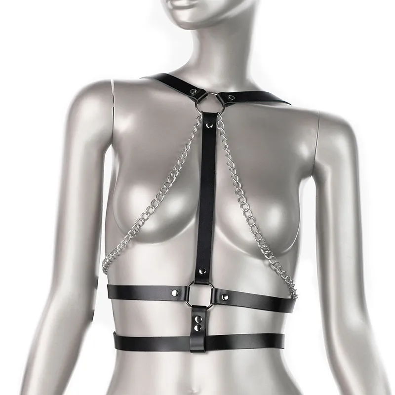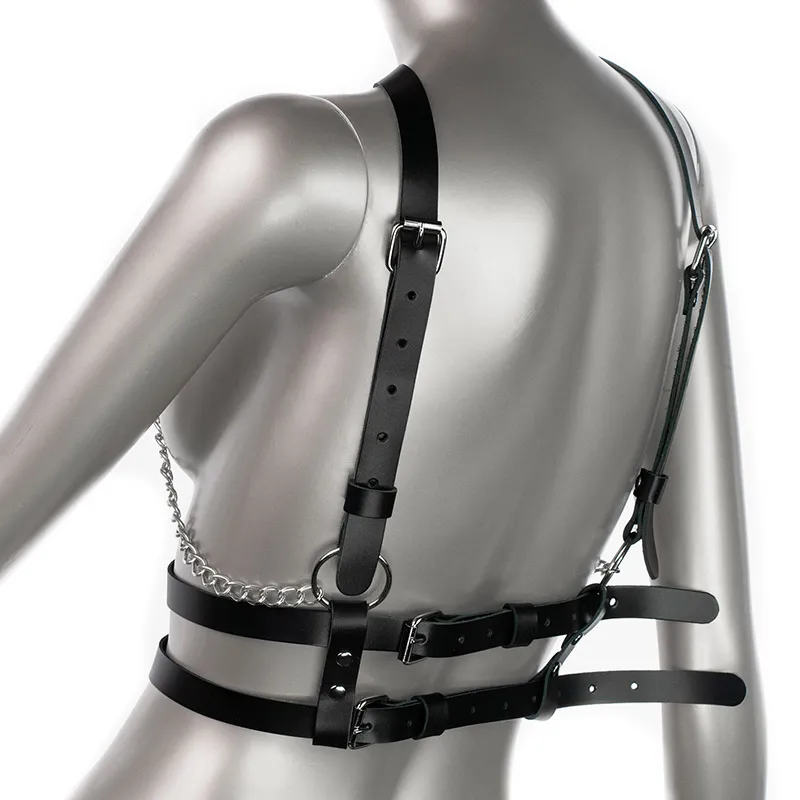 Женская портупея "Сесиль" от компании Passion Belts прекрасно дополнит любой образ, которому хочется придать особый стиль и воинственность. Портупея создана из нескольких ремней, соединенных между собой при помощи металлических колец. Также она декорирована тонкой цепочкой, которая будет красиво ниспадать на спину. Аксессуар можно носить как в повседневной жизни поверх одежды, так и сделать его пикантной деталью своего ролевого интимного костюма.
