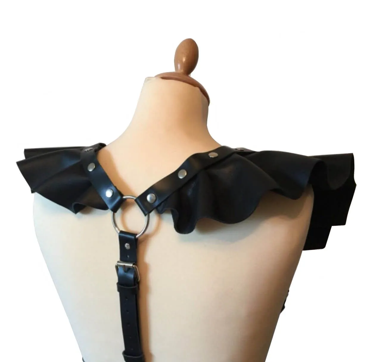 Портупея Ангел выполнена из натуральной кожи черного цвета. Крылья крепятся к ремням при помощи кнопок. Ремни регулируются на талии, спине и плечах. Обхват талии от 60 до 89 см.