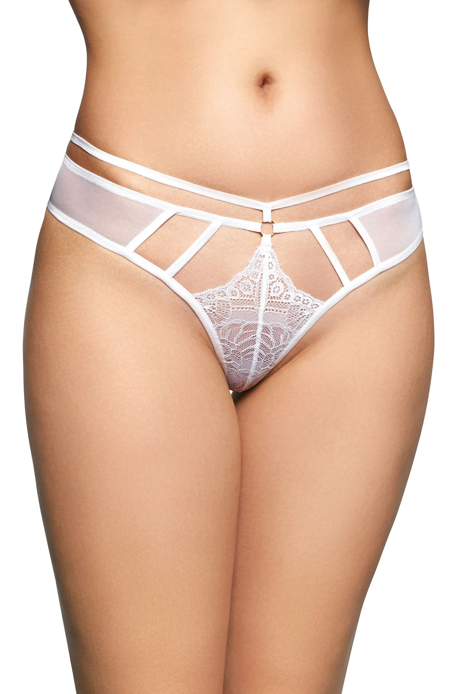 Изящные трусики-стринги с фигурными вырезами сделаны из тонкой полупрозрачной сетки. Ажурная вставка на передней части акцентирует на себе внимание и кокетливо спускается к интимным местам. Атласные полоски создают оригинальный геометрический узор, сексуальные вырезы украшают низ живота и ложбинку ягодиц. Стильные стринги средней посадки украсят фигуру, и добавят изюминку в сексуальный образ. Состав: 90% Полиамид 10% Эластан Цвет: белый Размер: M/L