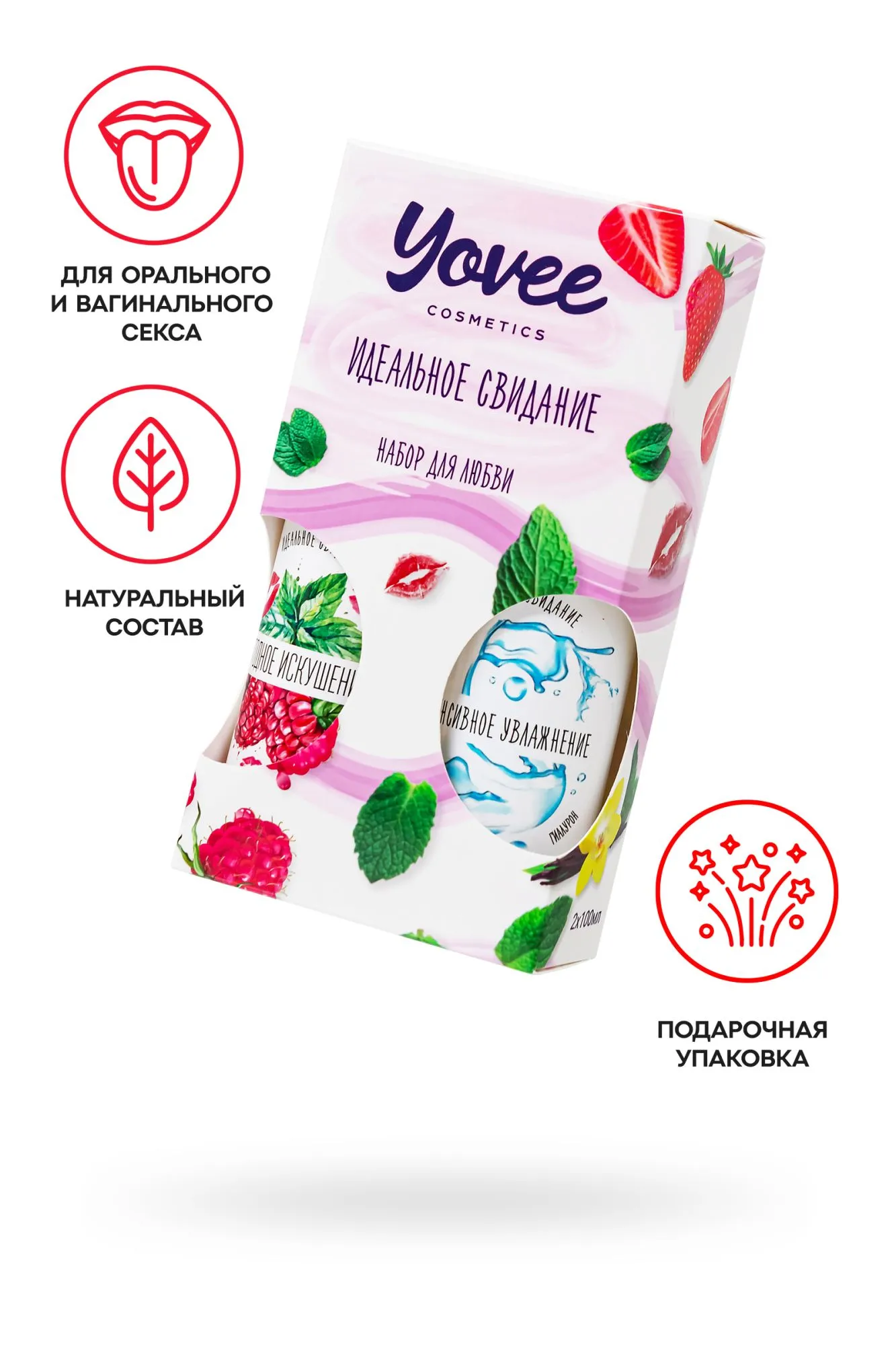 "Набор для любви" от бренда Yovee идеально подходит для эротических экспериментов. Входящий в набор съедобный интимный гель с соблазнительным мятно-малиновым вкусом и ароматом придаст оральному сексу еще больше пикантности и удовольствия, а увлажняющий интимный гель-смазка с гиалуроном обеспечит долгое скольжение, увлажнение и смягчение слизистой при вагинальном сексе. Используйте самостоятельно или смешайте гели, чтобы сделать вкус десерта менее сладким! Оба геля подходят как для вагинального, так и для орального секса. Совместимы со всеми видами презервативов и игрушек для взрослых. ИДЕАЛЬНЫЙ ПОДАРОК ВОЗМОЖНОСТЬ СОЗДАТЬ СВОЙ ВКУС Все гели Yovee имеют простой и безопасный состав: вода; гидроксиэтилцеллюлоза - стабилизатор эмульсий, регулятор вязкости; Д-пантенол защищает слизистые, запускает процесс регенерации тканей; сорбат калия и бензоат натрия – безопасные пищевые консерванты, разрешенные в натуральной и органической косметике; лимонная кислота помогает поддерживать оптимальный уровень рН, является естественным консервантом. БЕЗ ГЛИЦЕРИНА БЕЗ ПАРАБЕНОВ БЕЗ КРАСИТЕЛЕЙ Комплектация: 721009 Съедобная гель-смазка Yovee «Ягодное искушение» с Д-Пантенолом, со вкусом малины и мяты, 100 мл 721051 Увлажняющая гель-смазка Yovee «Интенсивное увлажнение» с Д-Пантенолом и гиалуроновой кислотой, 100 мл
