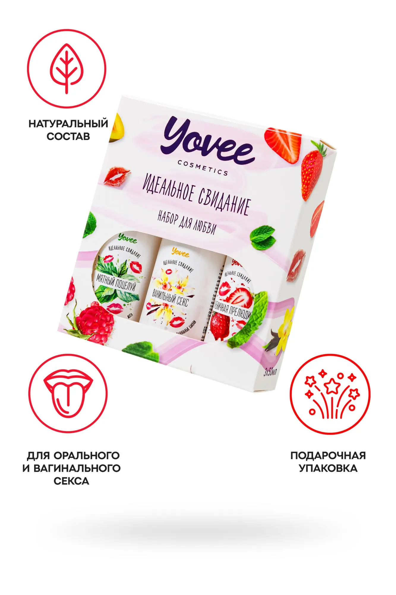 "Набор для любви" от бренда Yovee идеально подходит для эротических экспериментов. В одной упаковке три съедобных геля на водной основе. Первый обладает сочным вкусом и ароматом клубники, второй - соблазнительной мяты, третий - ванильно-сливочной нежностью. Используйте самостоятельно или создайте свой вкус! Несмотря на сладость, гели не содержат сахара в составе, не нарушают микрофлору и pH-баланс. Подходят как для вагинального, так и для орального секса. Совместимы со всеми видами презервативов и игрушек для взрослых. ИДЕАЛЬНЫЙ ПОДАРОК ВОЗМОЖНОСТЬ СОЗДАТЬ СВОЙ ВКУС Все гели Yovee имеют простой и безопасный состав: вода; гидроксиэтилцеллюлоза - стабилизатор эмульсий, регулятор вязкости; Д-пантенол защищает слизистые, запускает процесс регенерации тканей; сорбат калия и бензоат натрия – безопасные пищевые консерванты, разрешенные в натуральной и органической косметике; лимонная кислота помогает поддерживать оптимальный уровень рН, является естественным консервантом. БЕЗ ГЛИЦЕРИНА БЕЗ ПАРАБЕНОВ БЕЗ КРАСИТЕЛЕЙ БЕЗ САХАРА Комплектация: 721004 Съедобная гель-смазка Yovee «Клубничная прелюдия» с Д-Пантенолом, со вкусом клубники, 50 мл 721006 Съедобная гель-смазка Yovee «Мятный поцелуй» с Д-Пантенолом, со вкусом мяты, 50 мл 721012 Съедобная гель-смазка Yovee «Ванильный секс» с Д-Пантенолом, со вкусом ванильных сливок, 50 мл