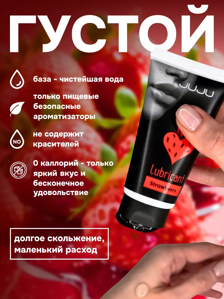 Съедобный лубрикант со вкусом клубники отлично подойдет для любого вида близости. Водная основа смазки позволяет разнообразить интимную жизнь, обеспечивая продолжительное шелковистое скольжение. Лубрикант можно использовать с любыми интим игрушками, а также с презервативами. Состав: вода очищенная, глицерин, гидроксиэтилцеллюлоза, бензоат натрия, сорбат калия, пропиленгликоль, ароматизатор пищевой, сахаринат натрия, лимонная кислота, объем – 50 мл, производитель – JuJu (Россия). срок годности-3 года.