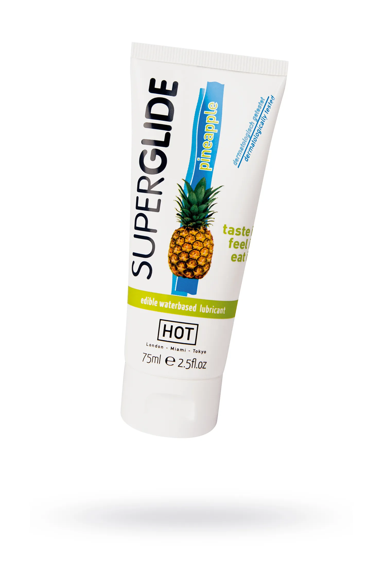 Съедобный гель-лубрикант на водной основе с ароматом и вкусом ананаса HOT Superglide. Прежде всего, экзотический вкус на губах и на языке создаст нужное настроение, а сам гель обеспечит долгое скольжение и незабываемое впечатление. Гель являются универсальным средством 3в1: это оральный съедобный гель, интимный смазывающий гель и кроме того, благодаря своему усиленному и долгому скольжению, гель прекрасно подойдет для мануальных техник, для интимного массажа. В составе содержатся натуральные экстракты ягод.