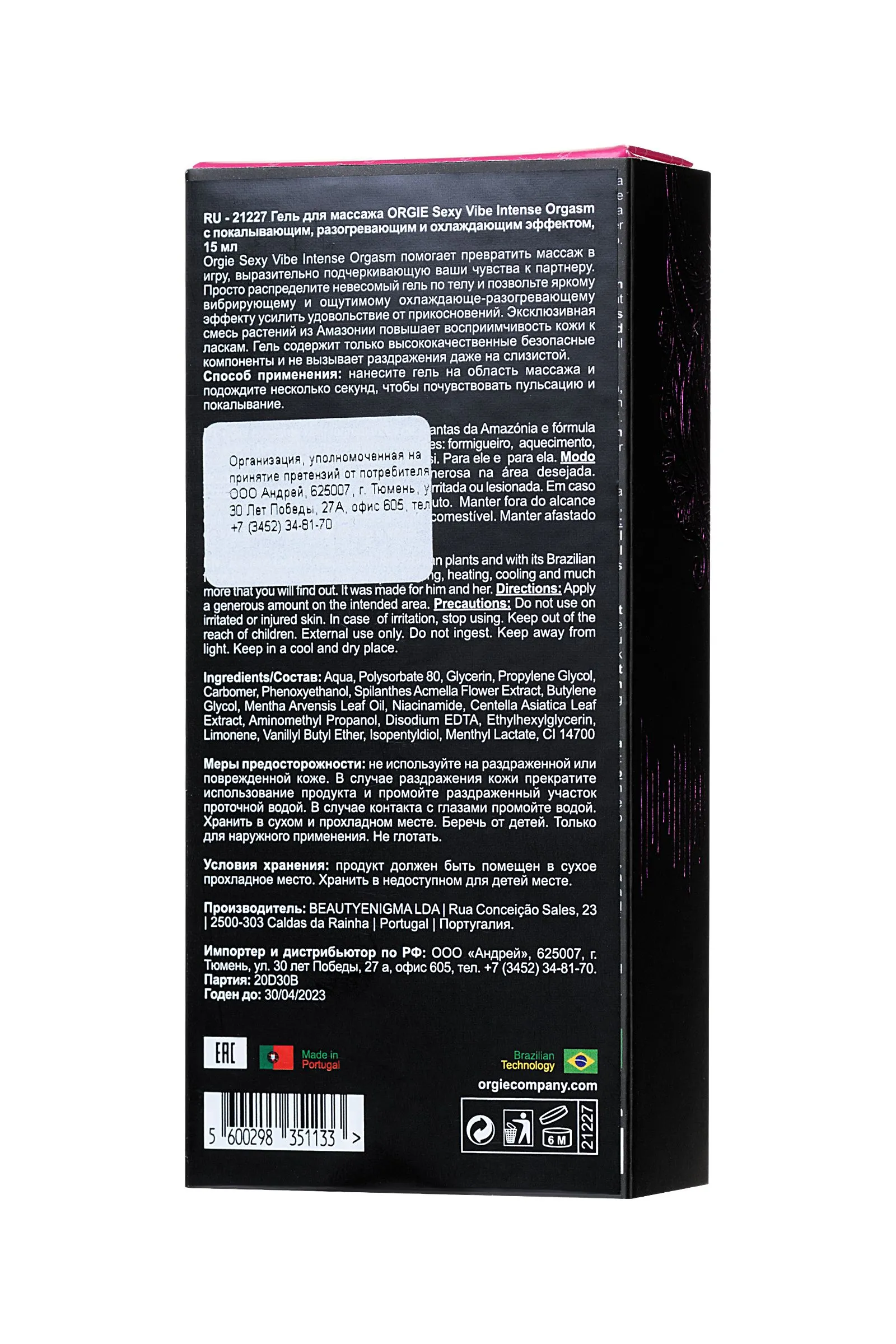 Orgie Sexy Vibe Intense Orgasm помогает превратить массаж в игру, выразительно подчеркивающую ваши чувства к партнеру. Просто распределите невесомый гель по телу и позвольте яркому вибрирующему и ощутимому охлаждающе-разогревающему эффекту усилить удовольствие от прикосновений. Эксклюзивная смесь растений из Амазонии повышает восприимчивость кожи к ласкам. Гель содержит только высококачественные безопасные компоненты и не вызывает раздражения даже на слизистой. Способ применения: нанесите гель на область массажа и подождите несколько секунд, чтобы почувствовать пульсацию и покалывание