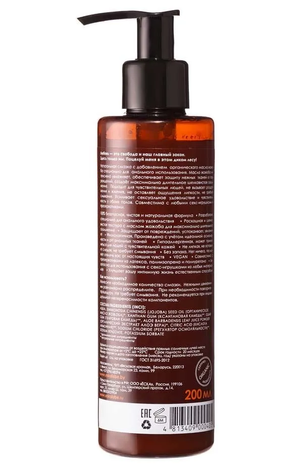 Ёska – это новое поколение лубрикантов со 100% безопасной, чистой и натуральной формулой. Формула содержит только сертифицированные органические экстракты и натуральные растительные ингредиенты, которые без вреда для здоровья помогут достичь полного комфорта и удовольствия во время занятий любовью. Натуральная смазка, с добавлением органического масла жожоба специально для анального использования. Масло жожоба интенсивно увлажняет, обеспечивает защиту нежных тканей от повреждений, создаёт максимально длительное шелковистое скольжение.