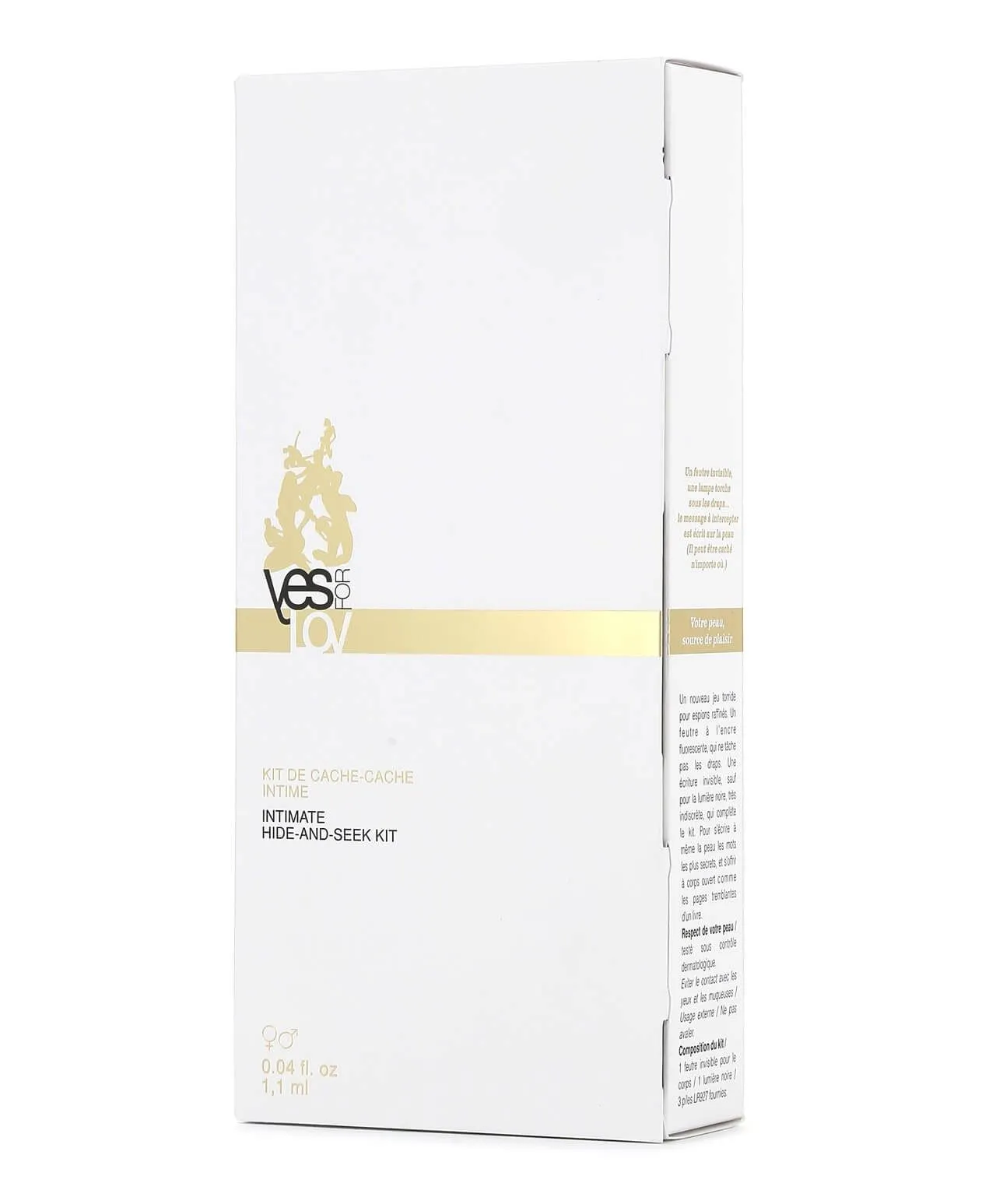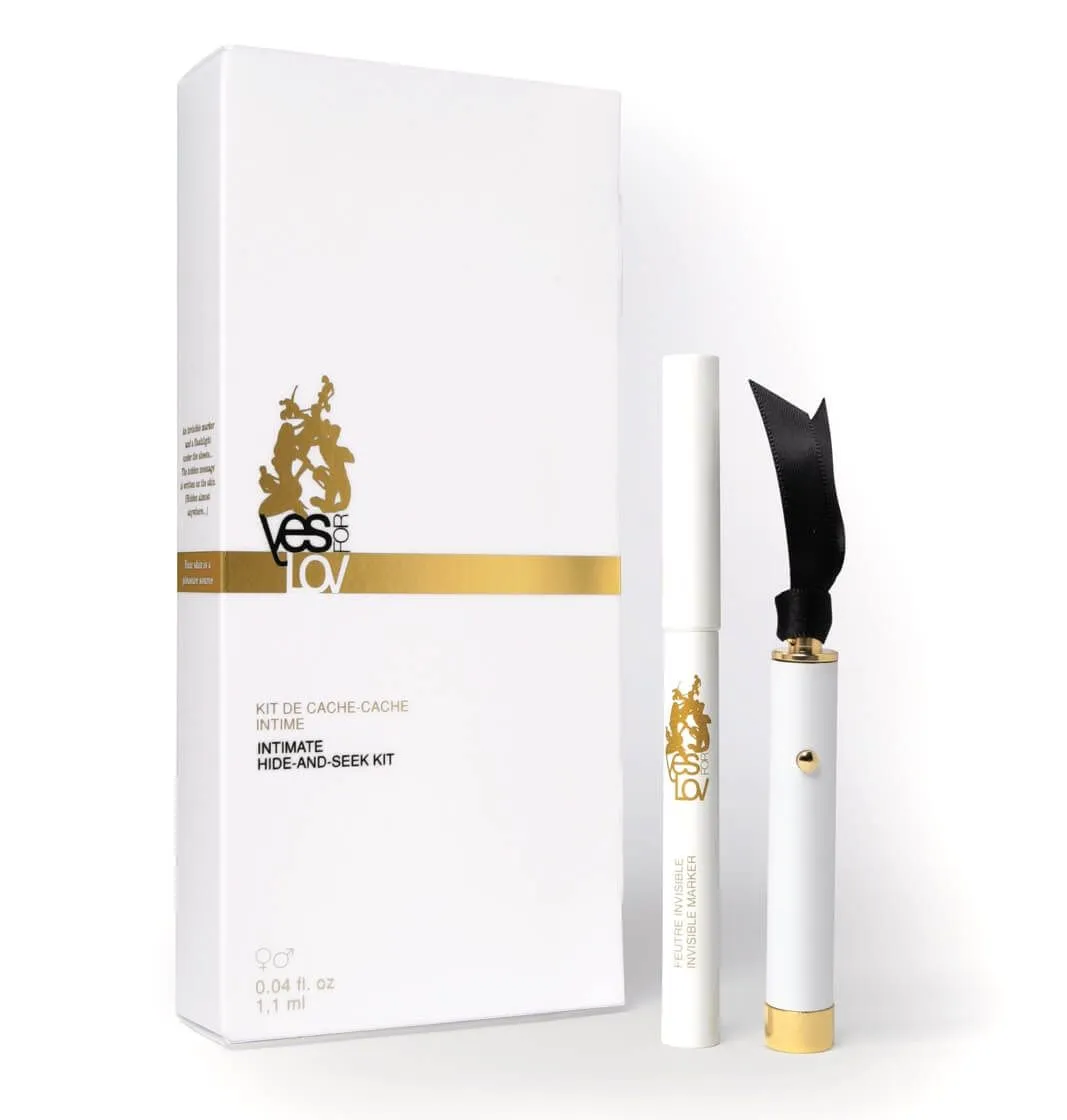 Набор для пар Intimate Hide and Seek Kit от бренда Yes-for-Lov состоит из флуоресцентного маркера и специального фонарика. Превратите свое тело в книгу с загадками, и пусть Ваша половинка найдет и отгадает их! Напишите свои желания в самых тайных и укромных уголках Вашего тела и вознаградите нашедшего. Флуоресцентный маркер, который не оставляет пятен на коже или одежде, виден лишь в свете небольшого ультрафиолетового фонарика, так что всё будет не так легко.