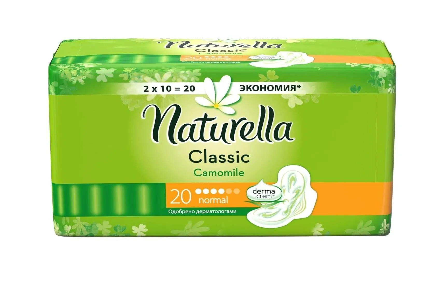 Прокладки женские Naturella Camomile Classic Normal с крылышками обеспечивают защиту от протеканий спереди и по бокам. Уникальность этих прокладок – в мягком верхнем слое с цветочным дизайном. Он обогащен полосками с кремом-бальзамом, содержащим экстракт ромашки, который обеспечивает нежный уход за кожей. Впитывающий слой состоит из волокон природного происхождения и обеспечивает надёжную защиту. Прокладки имеют приятный аромат ромашки.