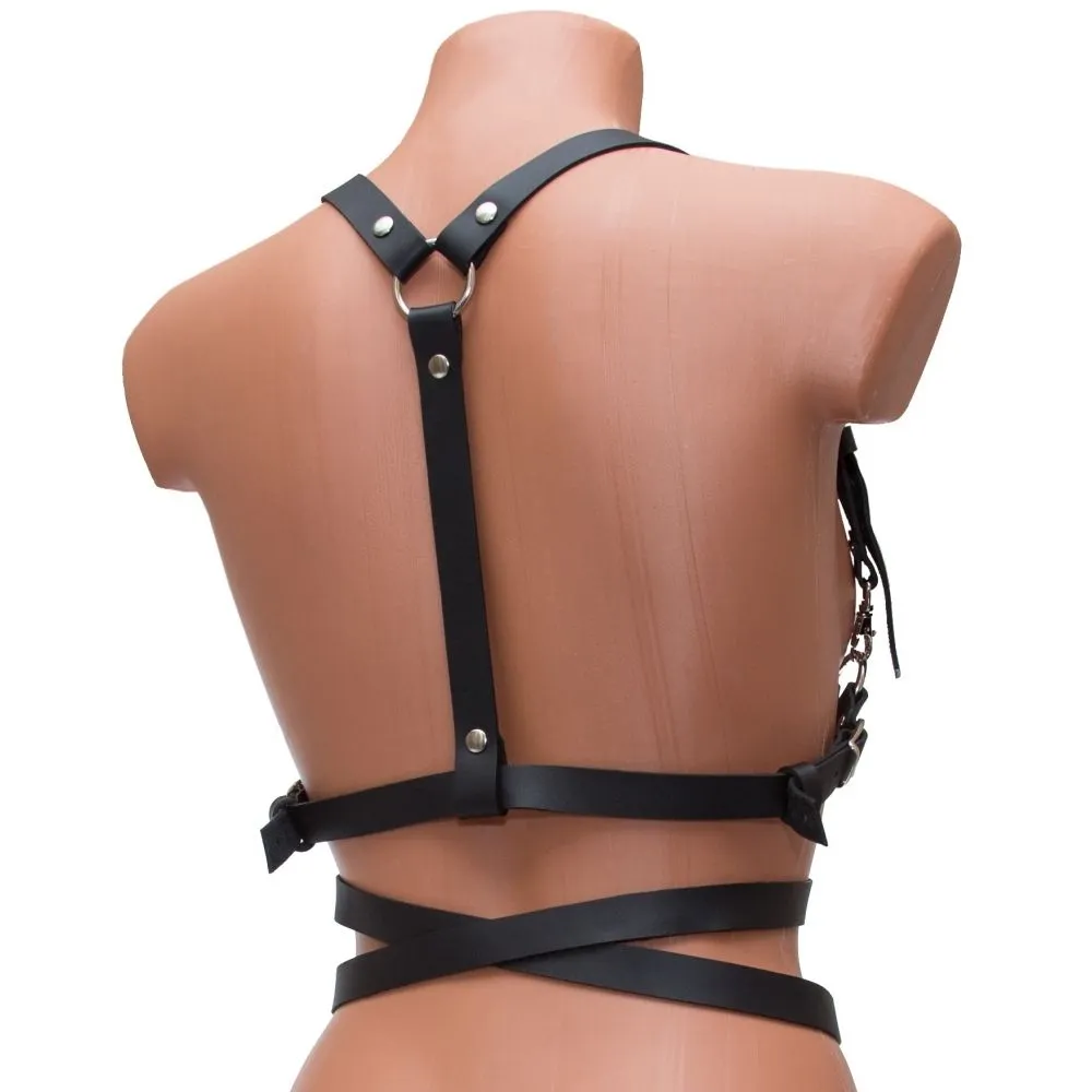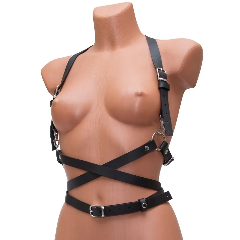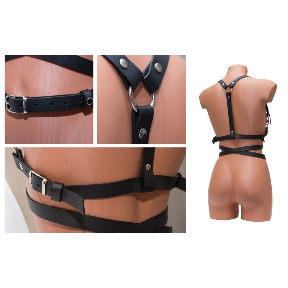 Женская портупея прекрасно дополнит любой образ, которому хочется придать особый стиль и воинственность. Данный аксессуар изготовлен из плотной натуральной кожи. Вся фурнитура выполнена из нержавеющей стали с никелированным покрытием. Широкий ремень комфортно прилегает к телу и дает ощущение поддержки, а удобный фиксатор поможет отрегулировать силу обхвата. Плечевые ремни так же удобно регулируются легкодоступными застежками.