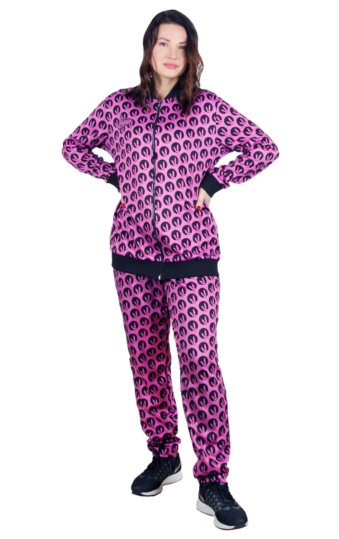 Индивидуальный спортивный костюм сделает вас самым заметным в зале! А если вы не являетесь знатным спортсменом, то такой костюм станет интересным луком для прогулок с друзьями или вечерних посиделок дома. Фирменные черно-розовые цвета привлекают внимание, но не отвлекают его от носителя образа. Принт на штанах и толстовке не рябит в глазах, подчеркивая уникальность образа.
