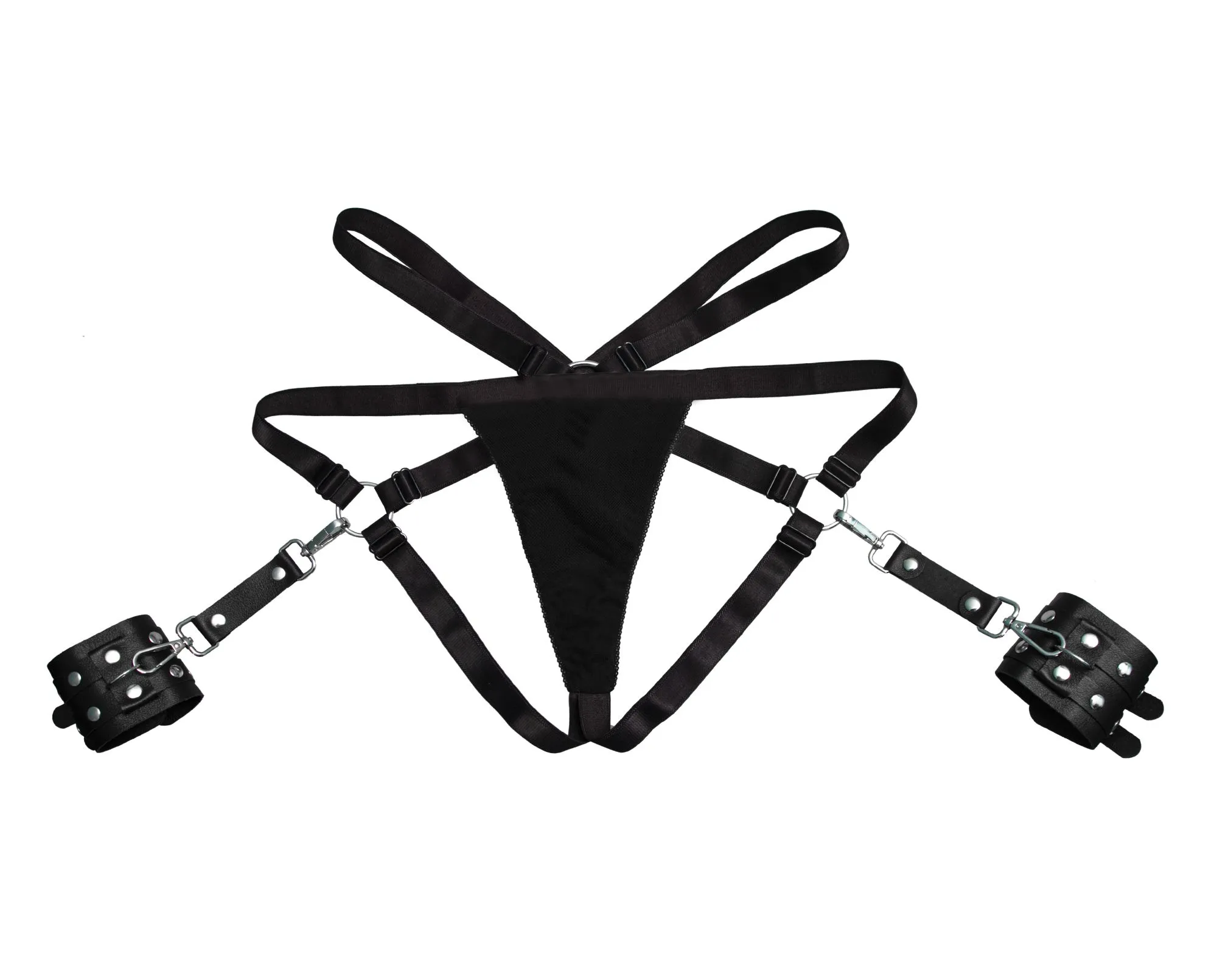Пояс с гартерами и наручниками, качественная фурнитура серебряного цвета, все детали регулируются по длине или ширине, наручники на карабинах, их можно отстегнуть и перестегнуть.